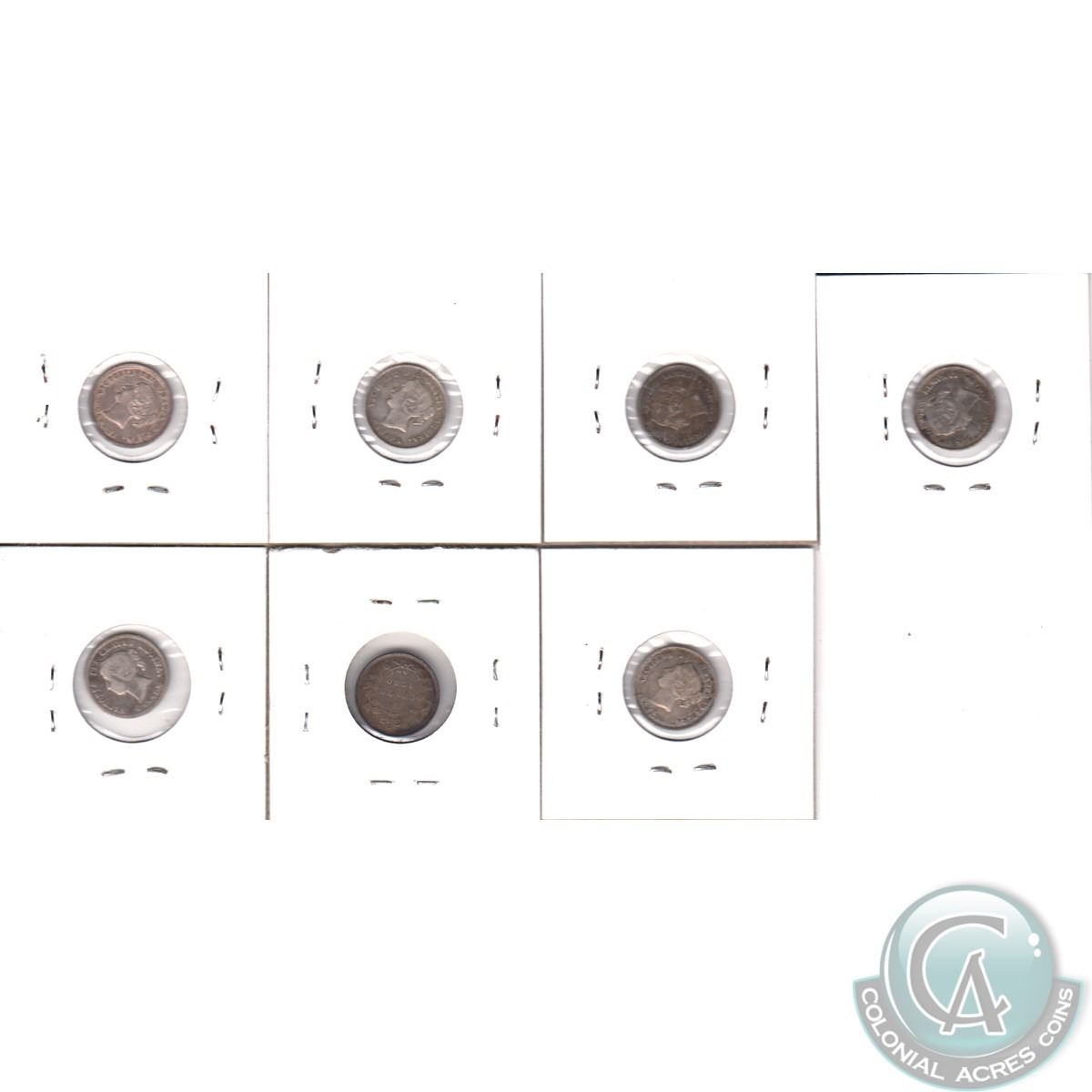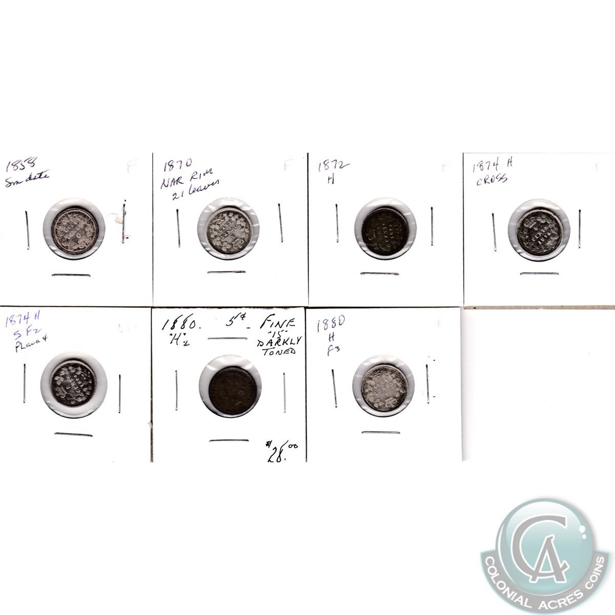 5-cent 1858 SD Fine, 1870 Fine, 1872H Fine, 1874H Cr4 Fine, 1874H Pl 4 VG, 1880H Obv2 F-VF, & 1880H Obv3 Fine. 7pcs