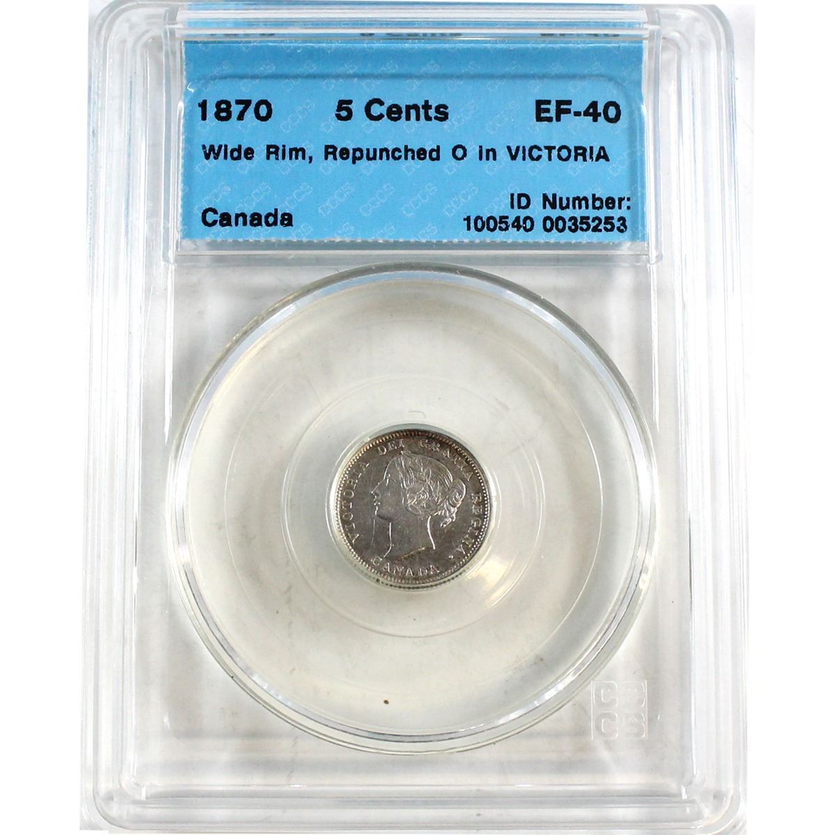 5-cent 1870 Wide Rim; Repunched O in Victoria CCCS Certified EF-40