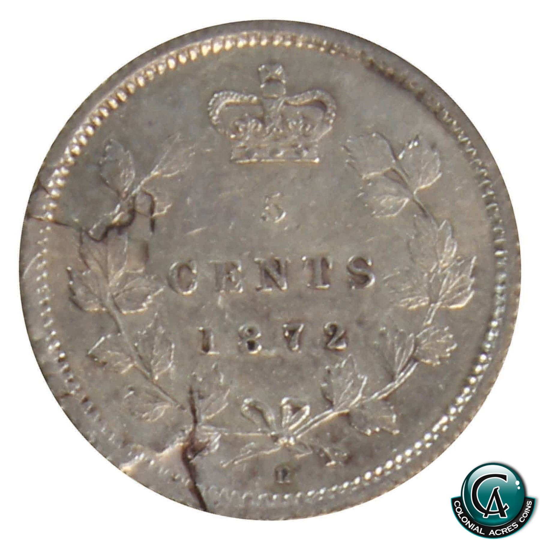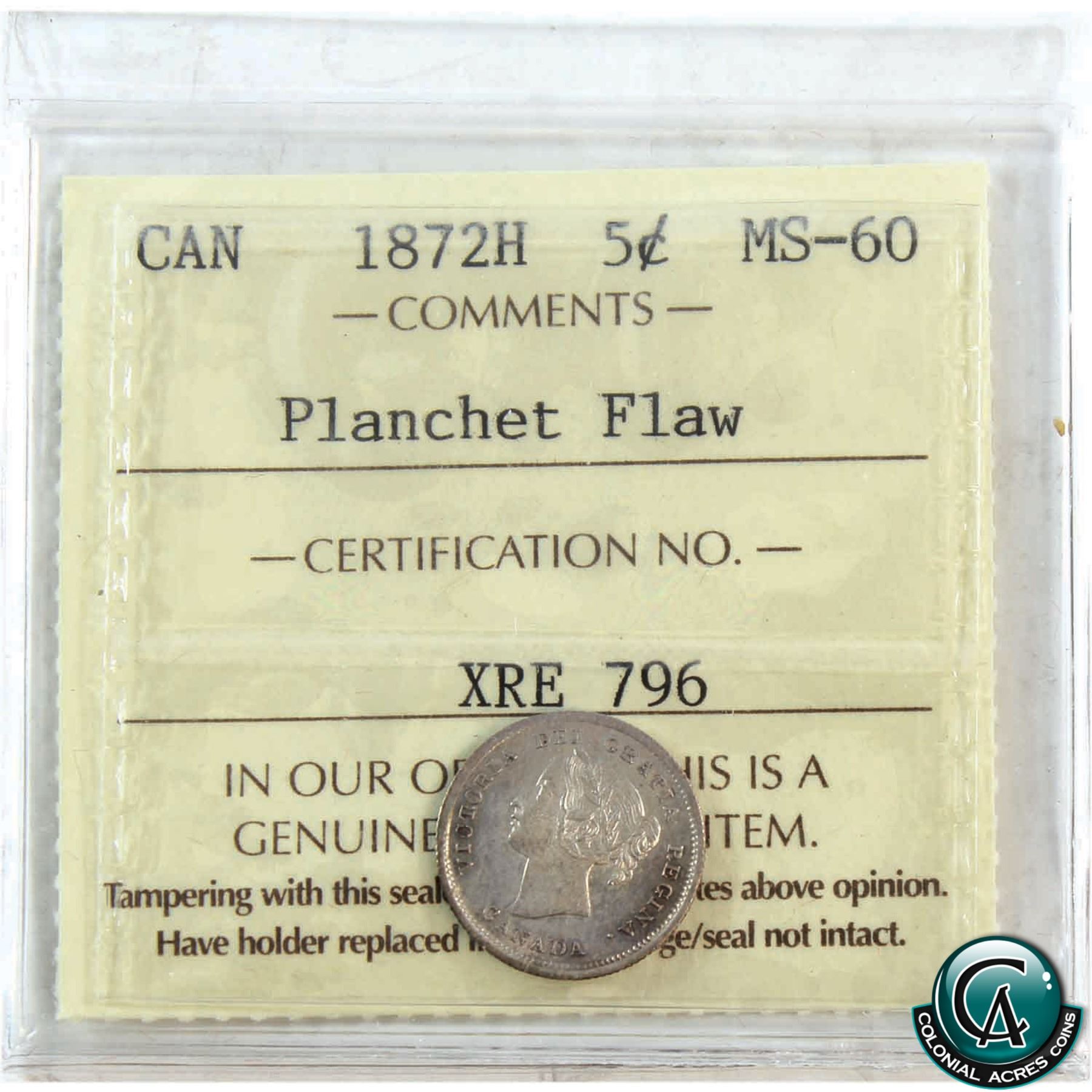 5-cent 1872-H ICCS Certified MS-60 with Planchet Flaw on the Reverse, looks to be partial delamination.