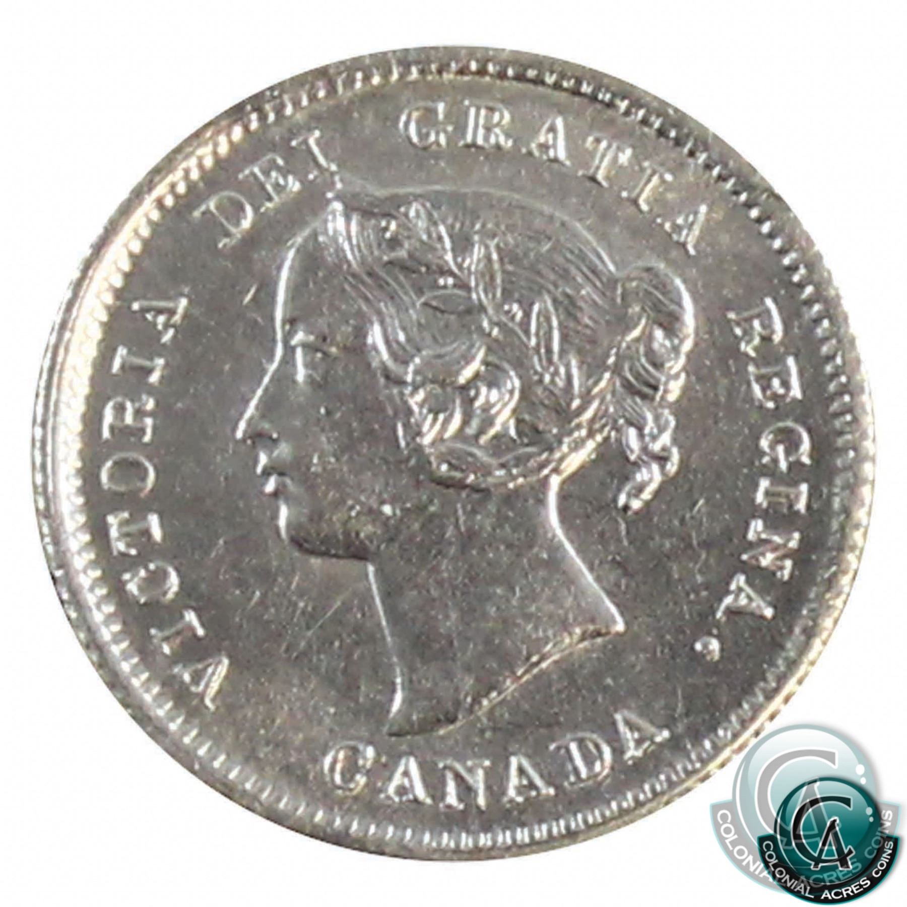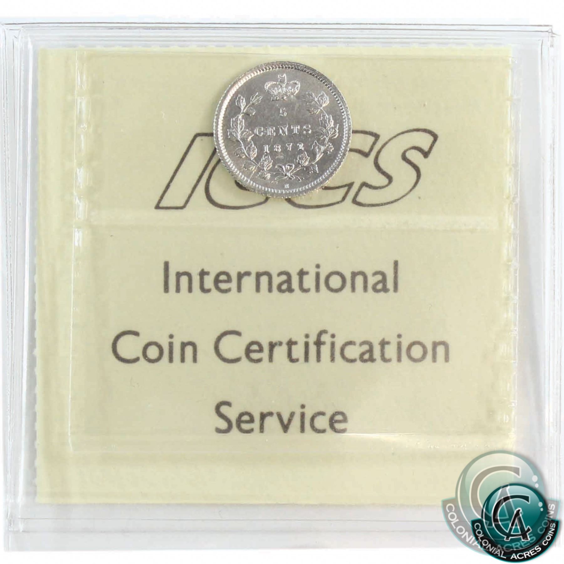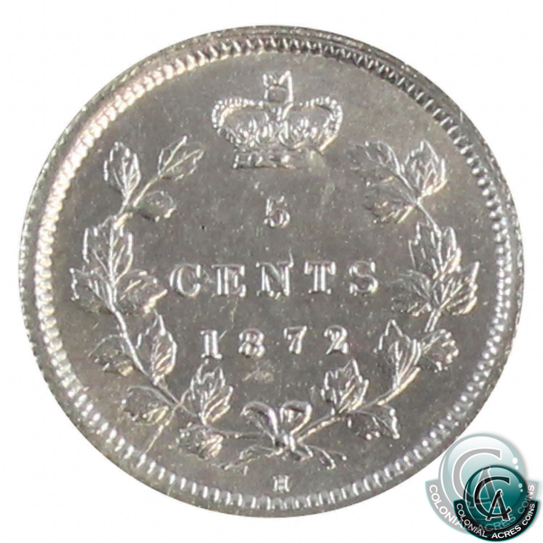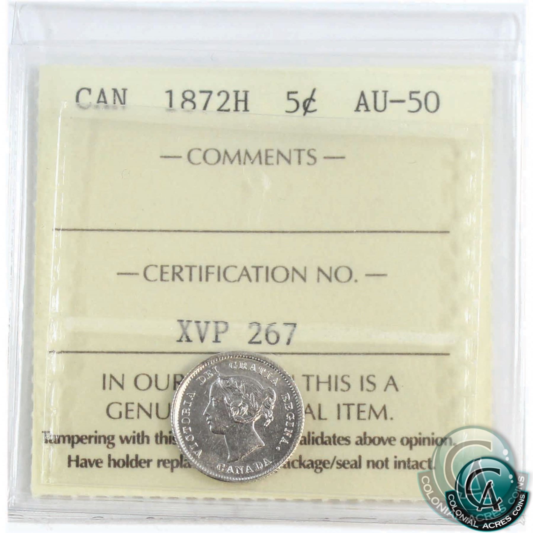 5-cent 1872H ICCS Certified AU-50. An intersting coin with some die clashes throughout the obverse and a small struck through error on the reverse (not mentioned on holder). Coin appears to be in higher grade then stated on holder, worth a good look!