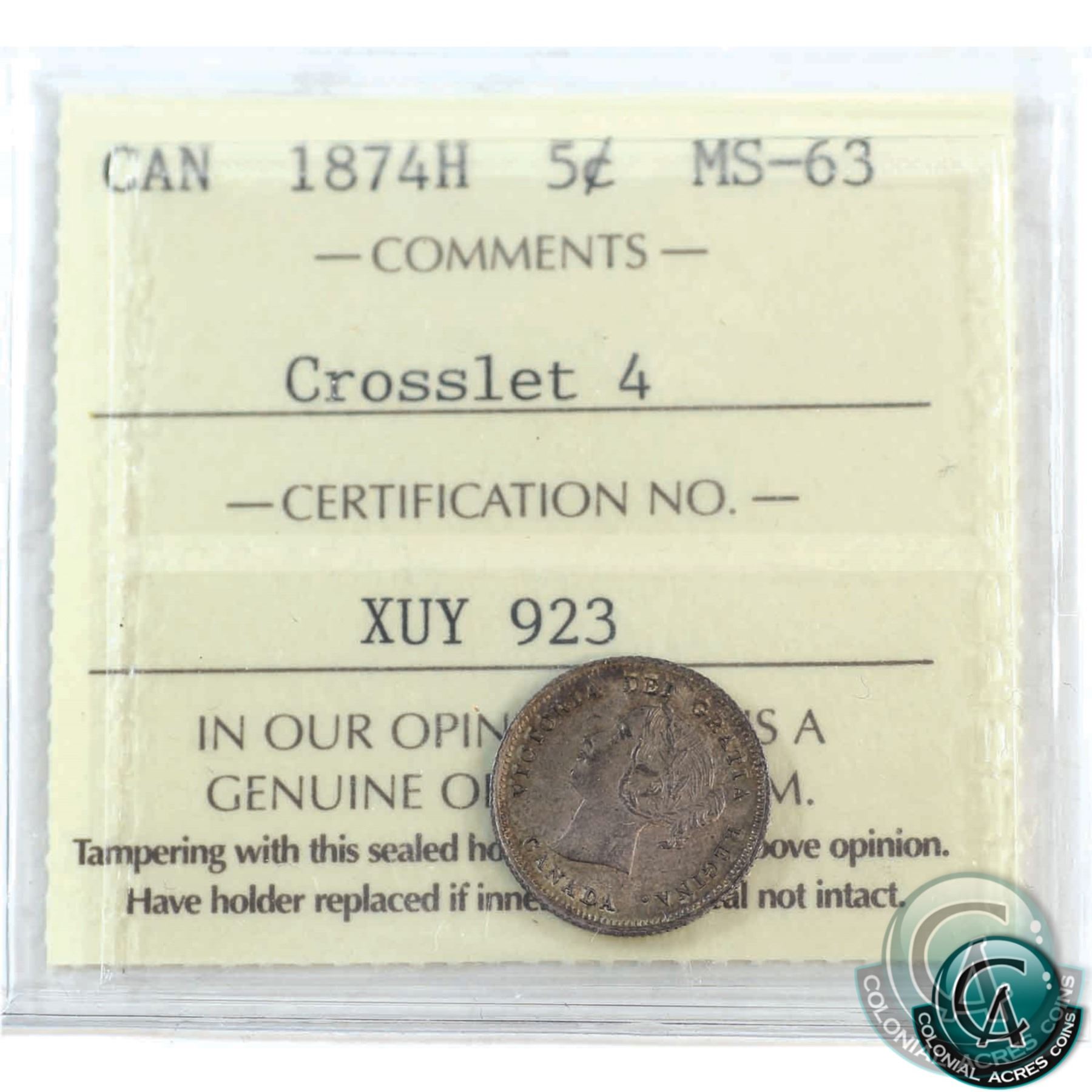 5-cent 1874H Crosslet 4 ICCS Certified MS-63! Medium to light toning throughout with hints of mint lustre within the borders.
