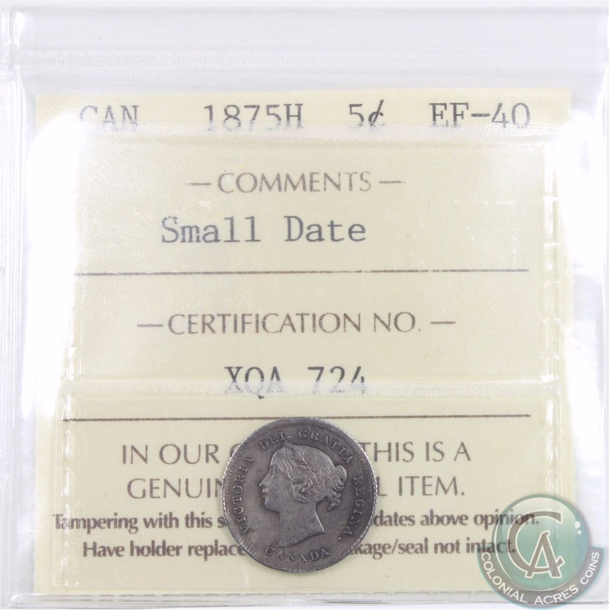 5-cent 1875H Small Date ICCS Certified EF-40. A key date coin with great eye appeal and original Patina.
