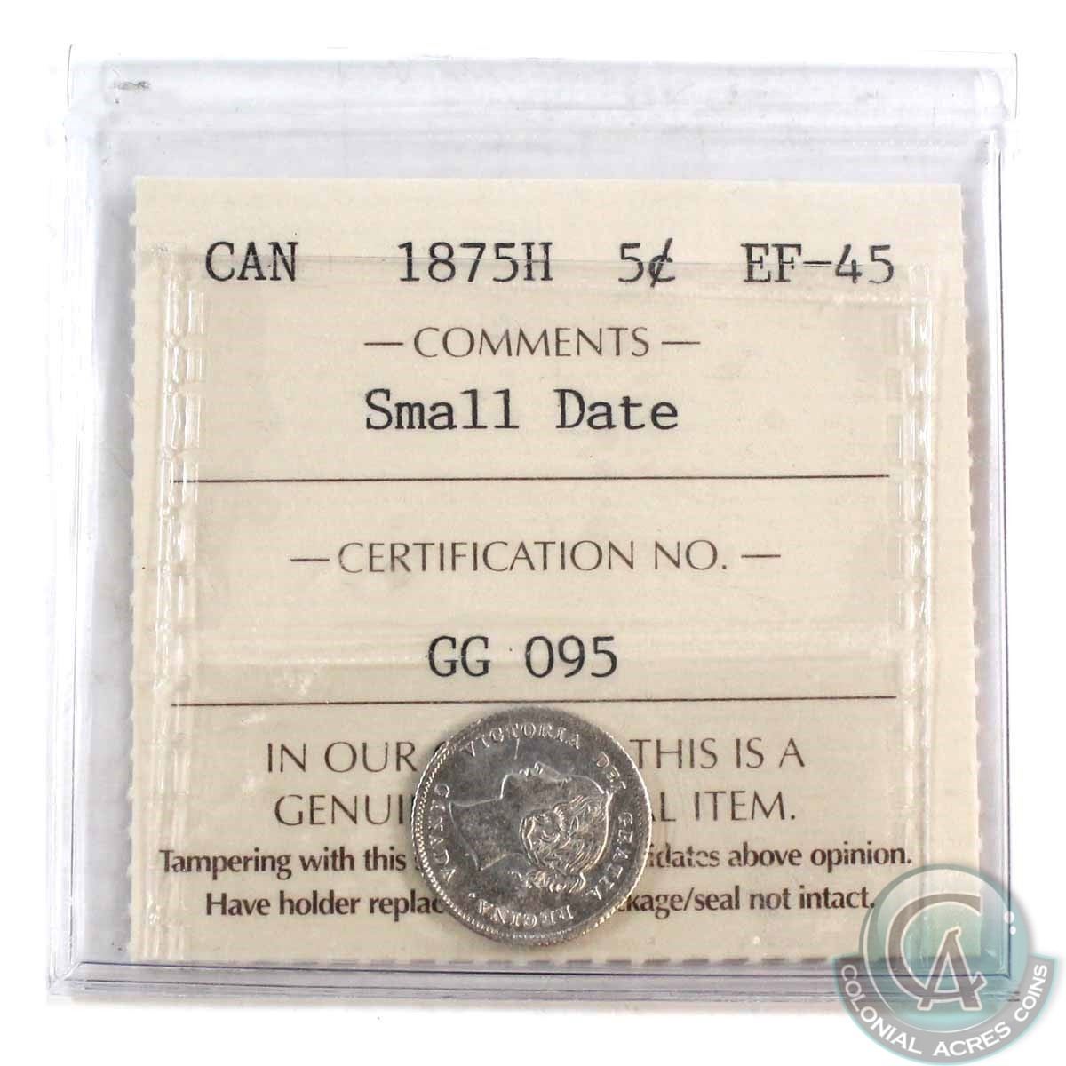 5-cent 1875H Small Date ICCS Certified EF-45
