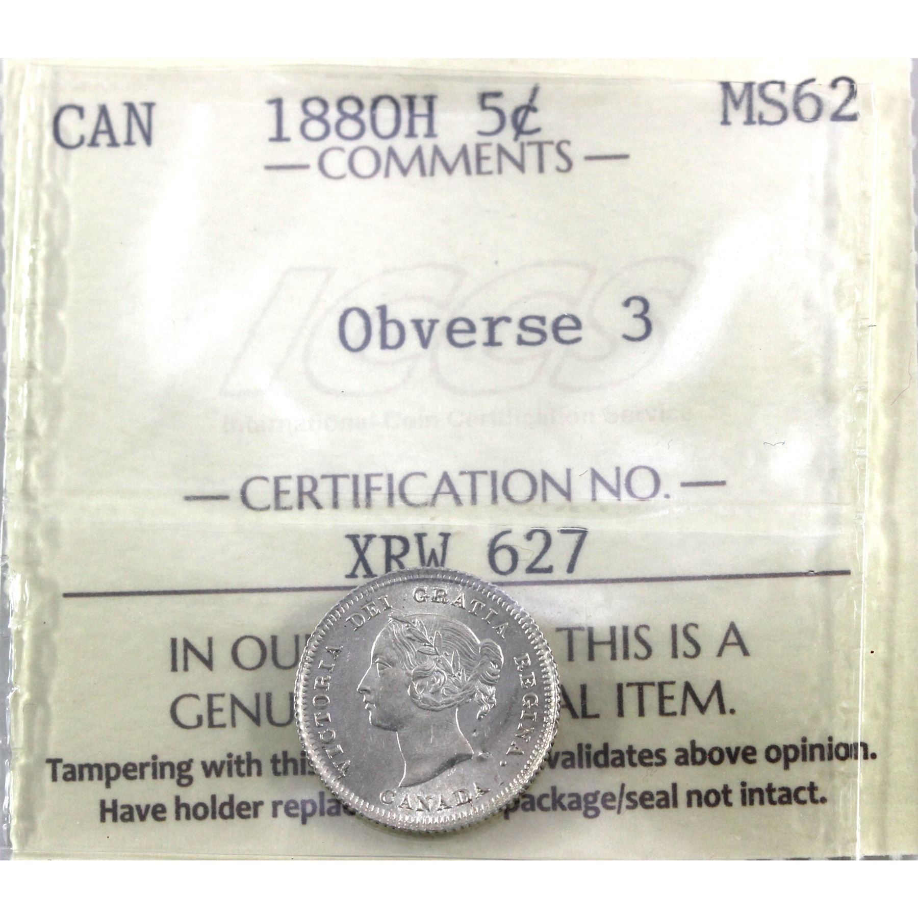 5-cent 1880H Obv. 3 ICCS Certified MS-62!