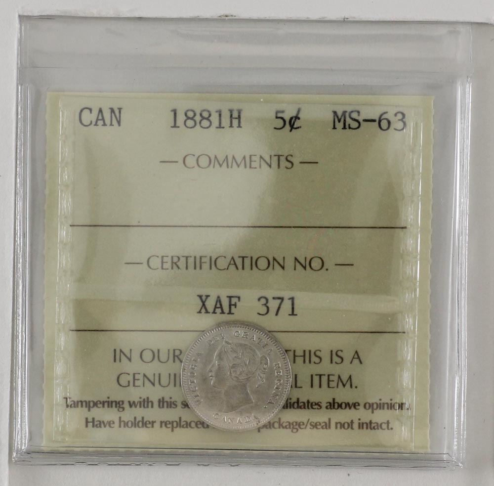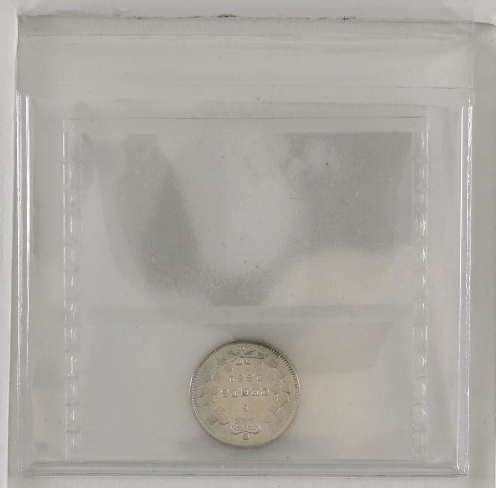 5-cent 1881H Mint State Victorian coin. ICCS certified MS63. A nice clean soft white coin with exceptional details.