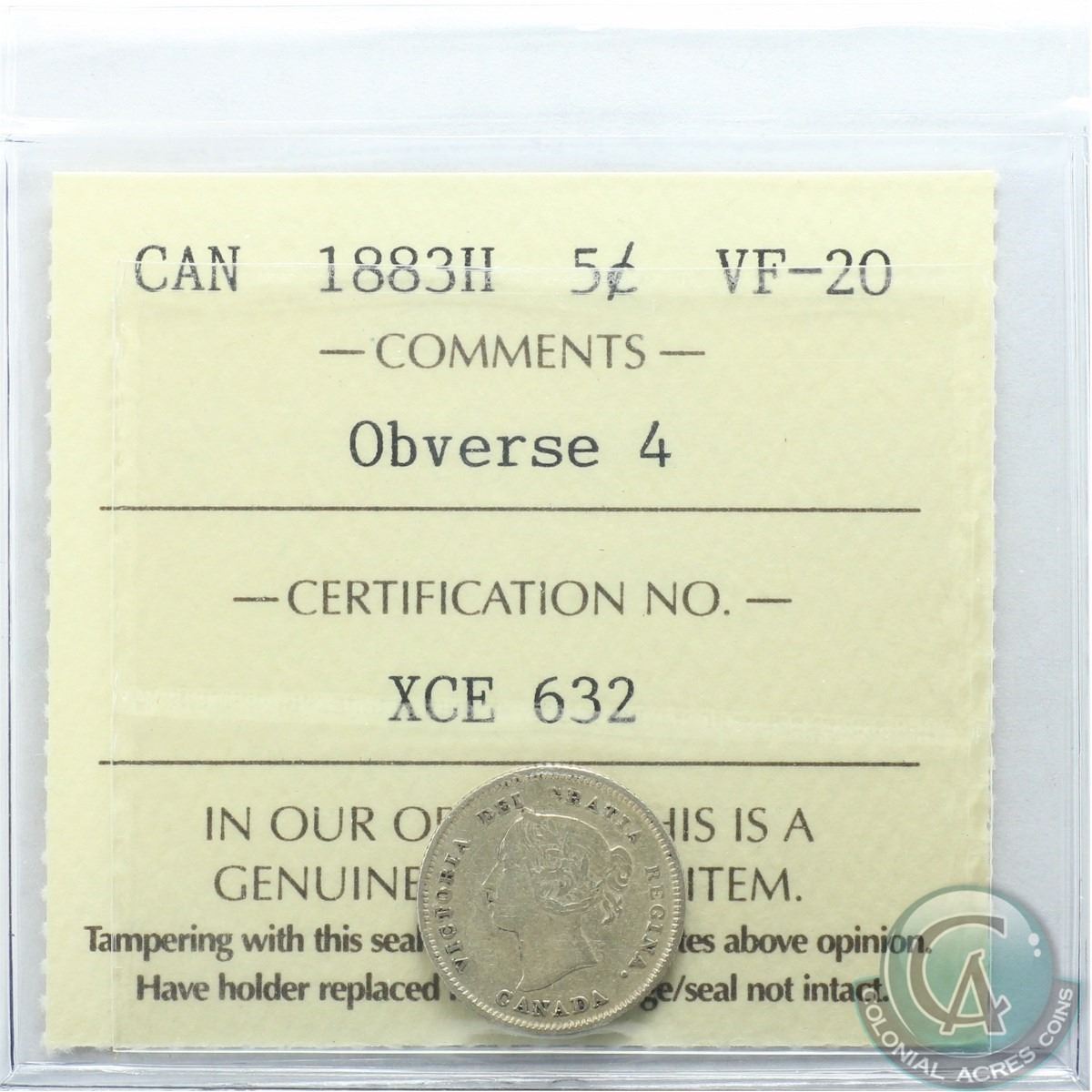 5-cent 1883H Obverse 4 ICCS Certified VF-20