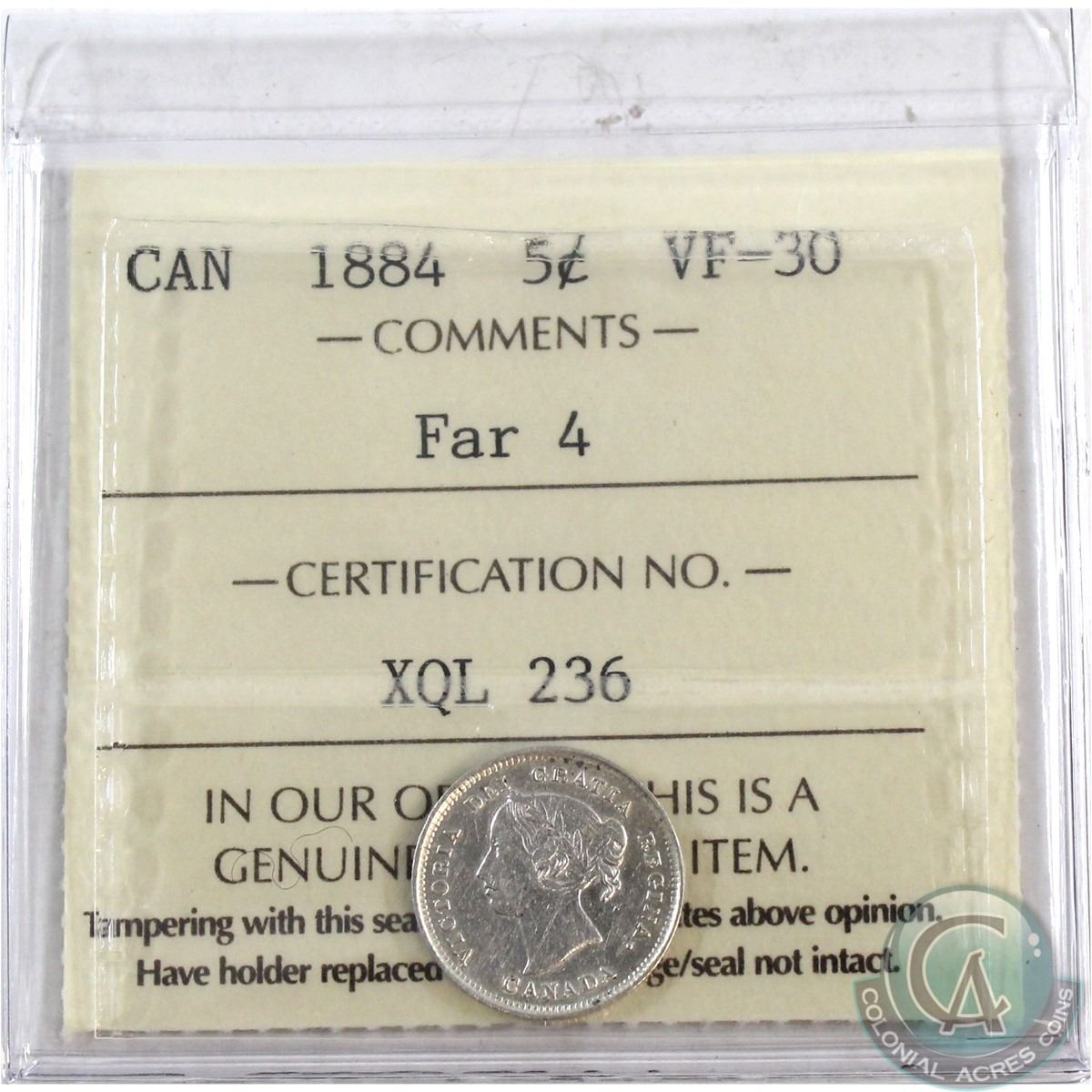 5-cent 1884 Far 4 ICCS Certified VF-30. *Key Date*