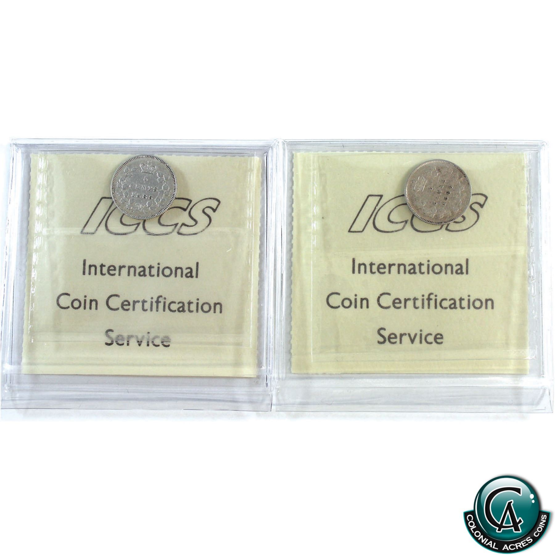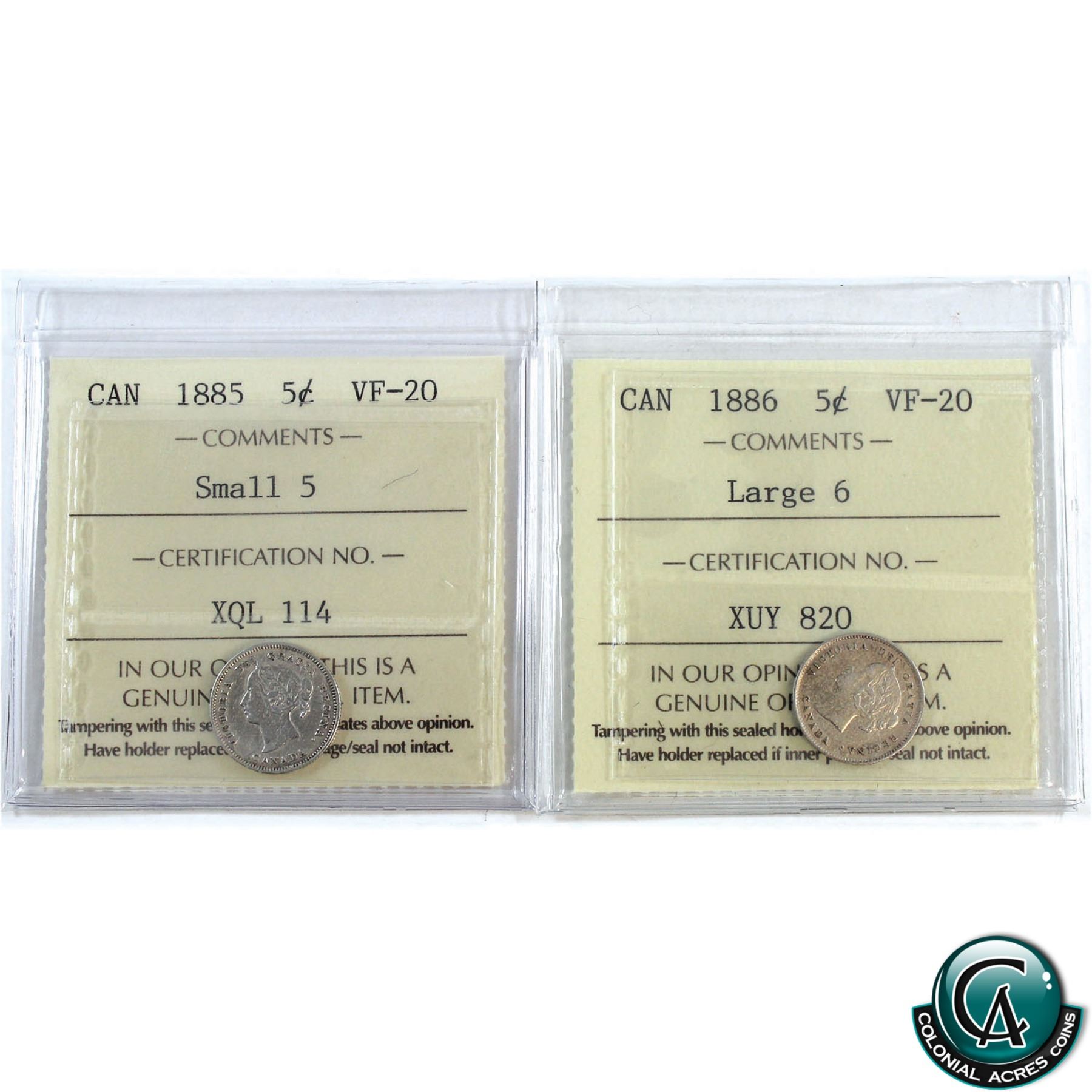 5-cent 1885 Small 5 & 1886 Large 6 ICCS Certified VF-20. 2pcs