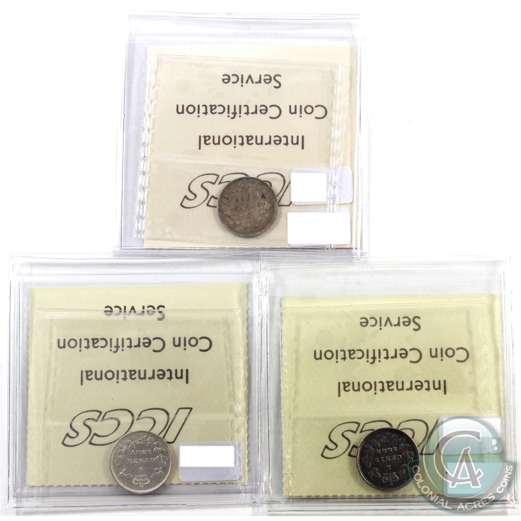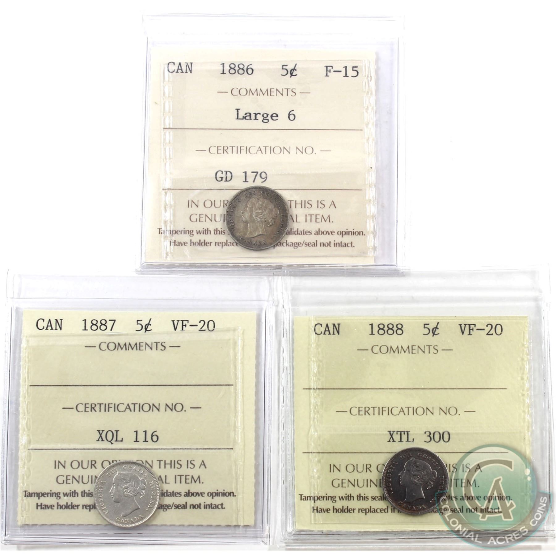5-cent 1886 Large 6 ICCS F-15, 1887 ICCS VF-20 & 1888 ICCS VF-20. 3pcs