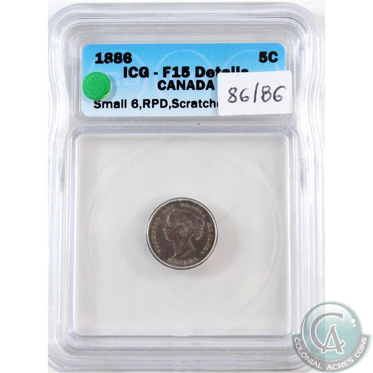5-cent 1886 Small 86/86; Scratched ICG Certified F-15, Scarce