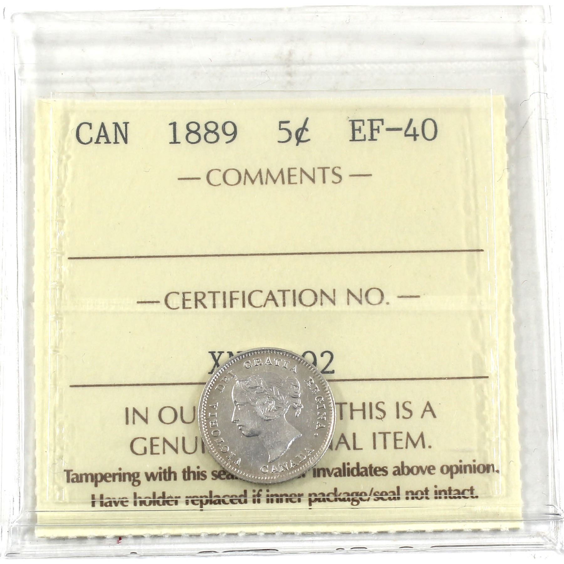 5-cent 1889 ICCS Certified EF-40!