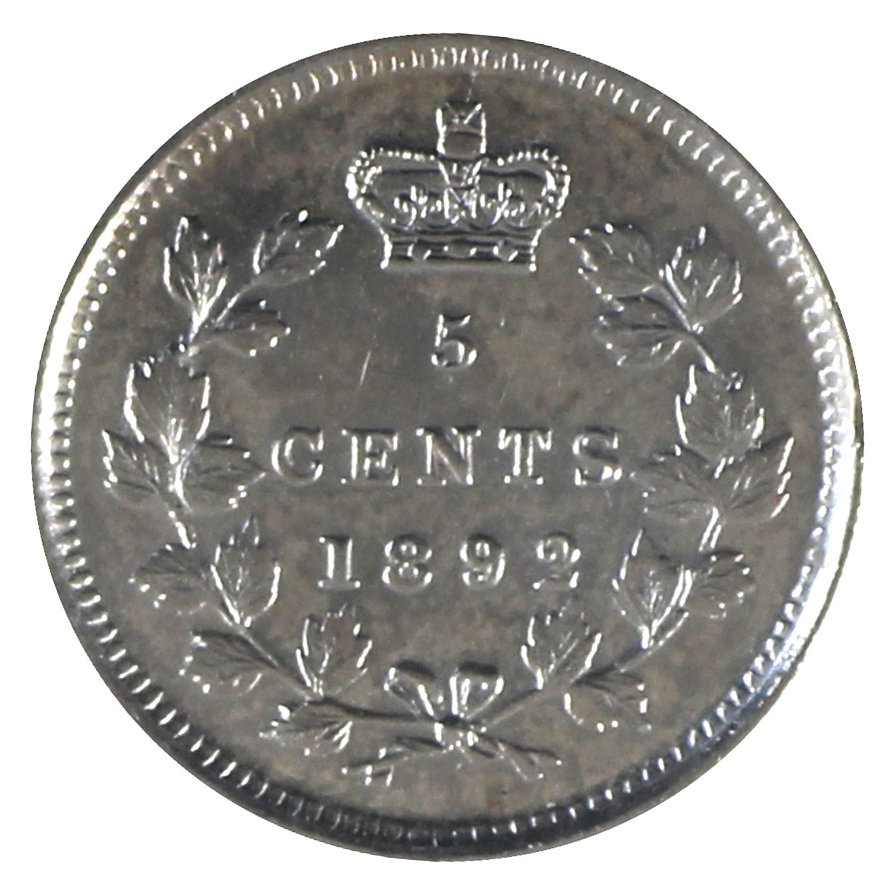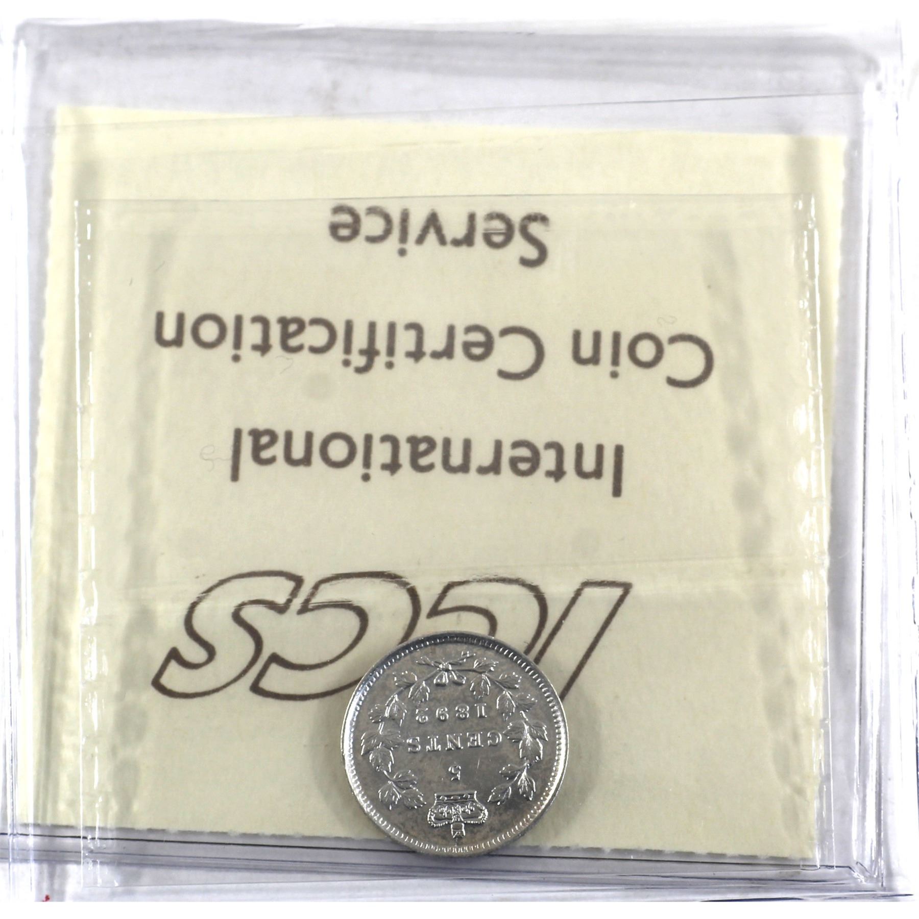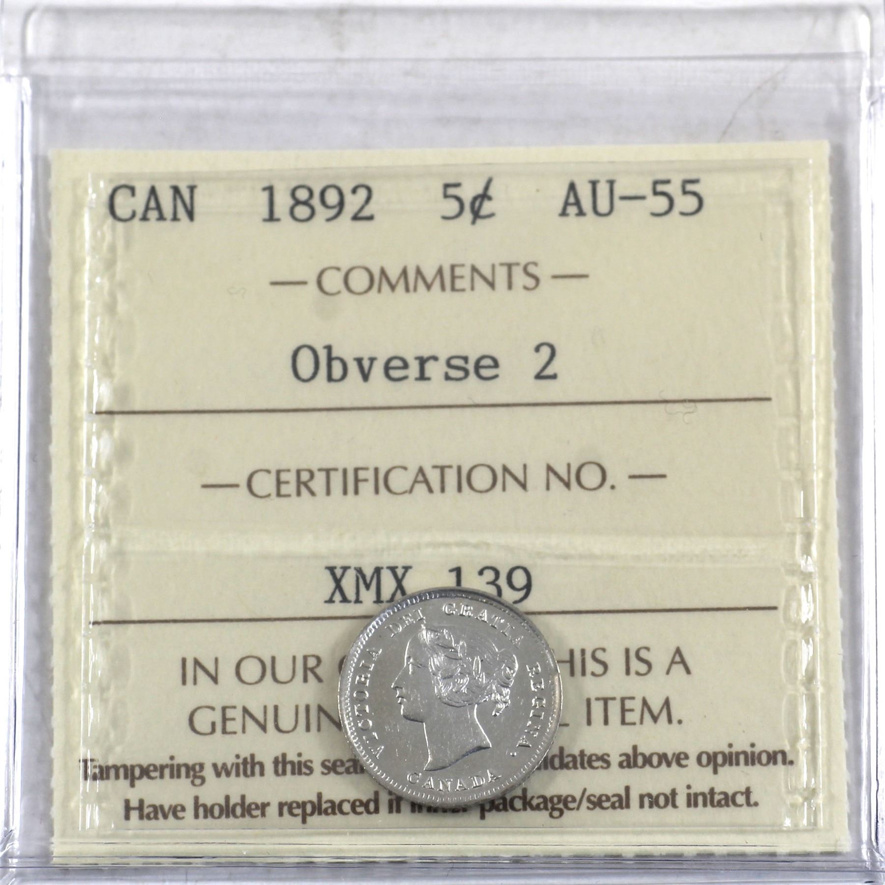 5-cent 1892 Obverse 2 ICCS Certified AU-55. A bright coin with strong strike qualities.