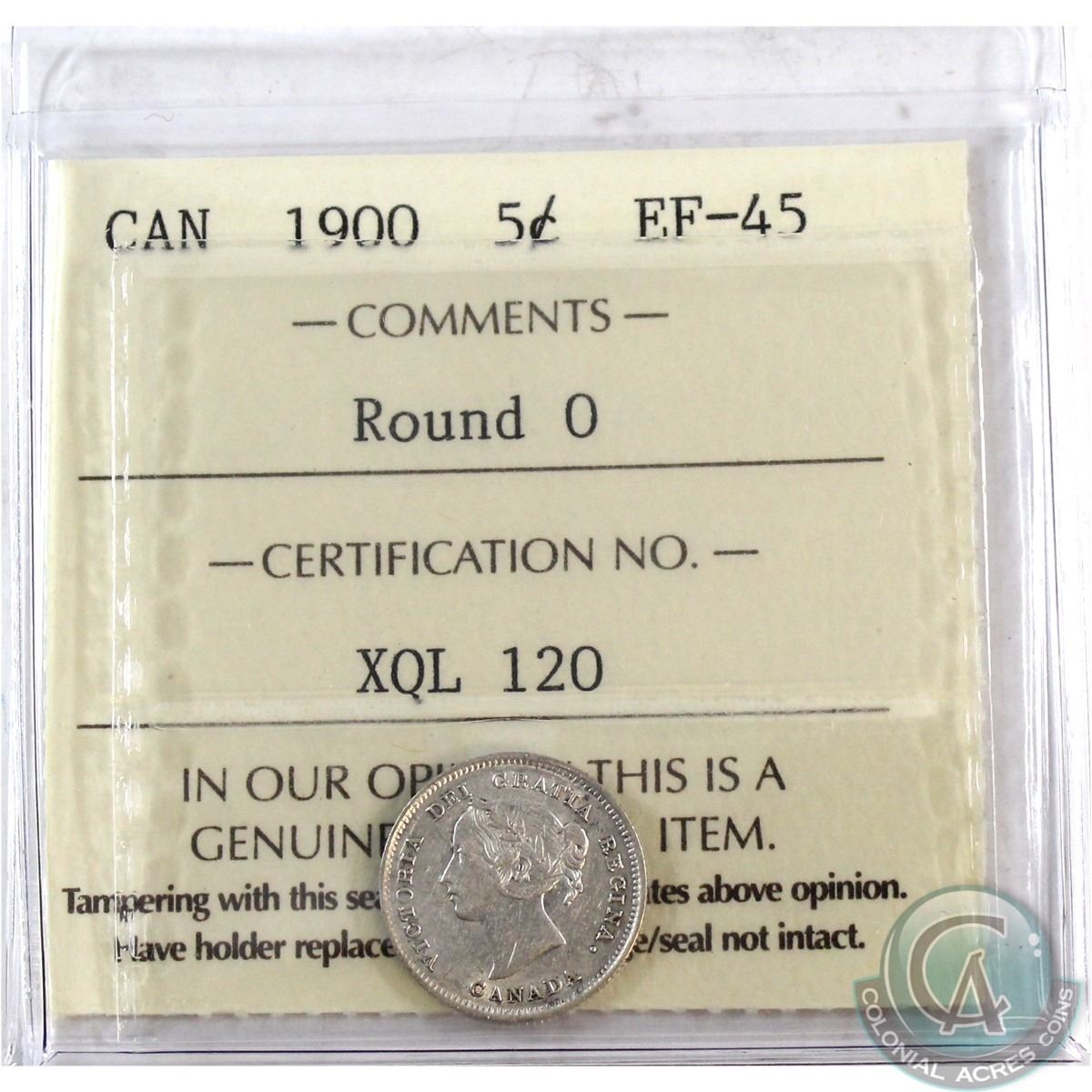 5-cent 1900 Round 0 ICCS Certified EF-45.