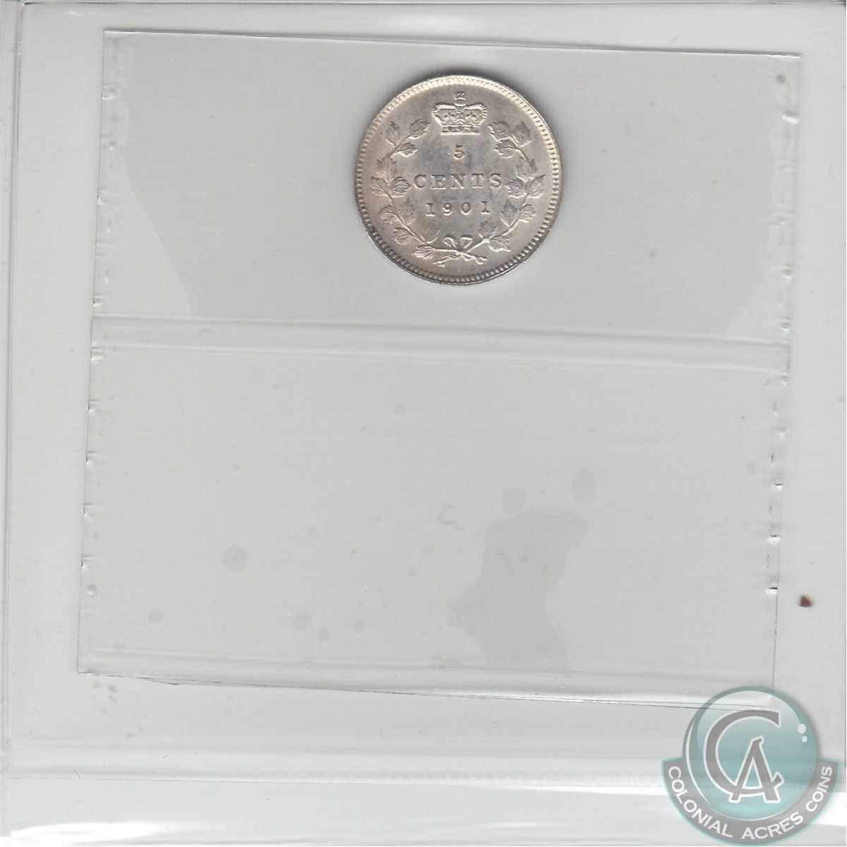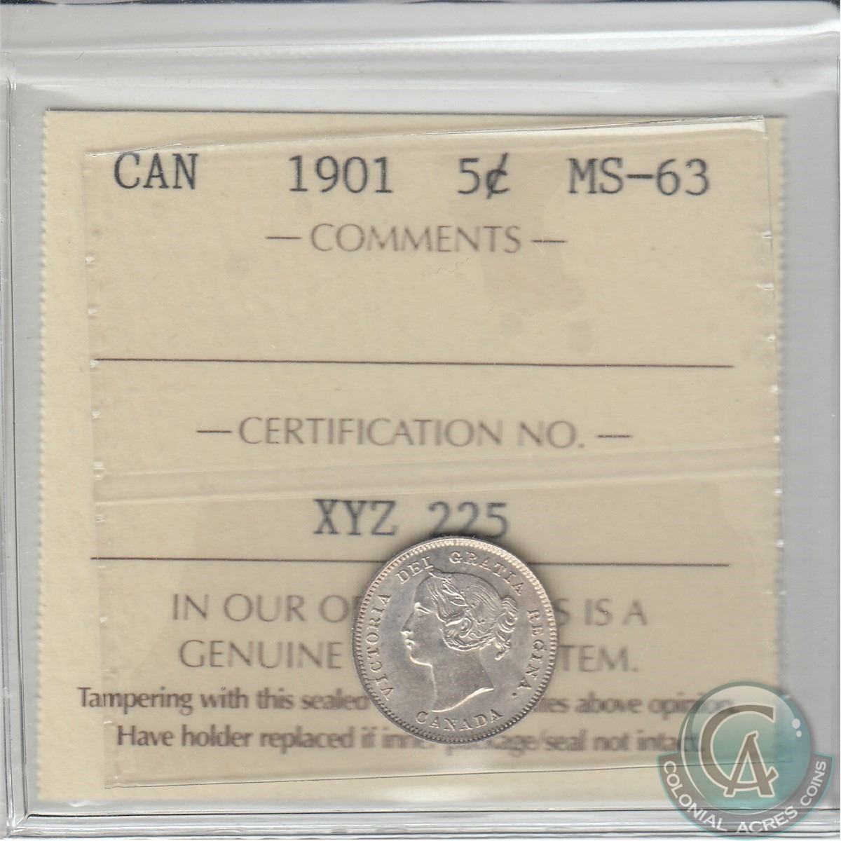5-cent 1901 ICCS Certified MS-63. A choice coin with Soft Satin white finishes, a great example of the last Victorian issue.