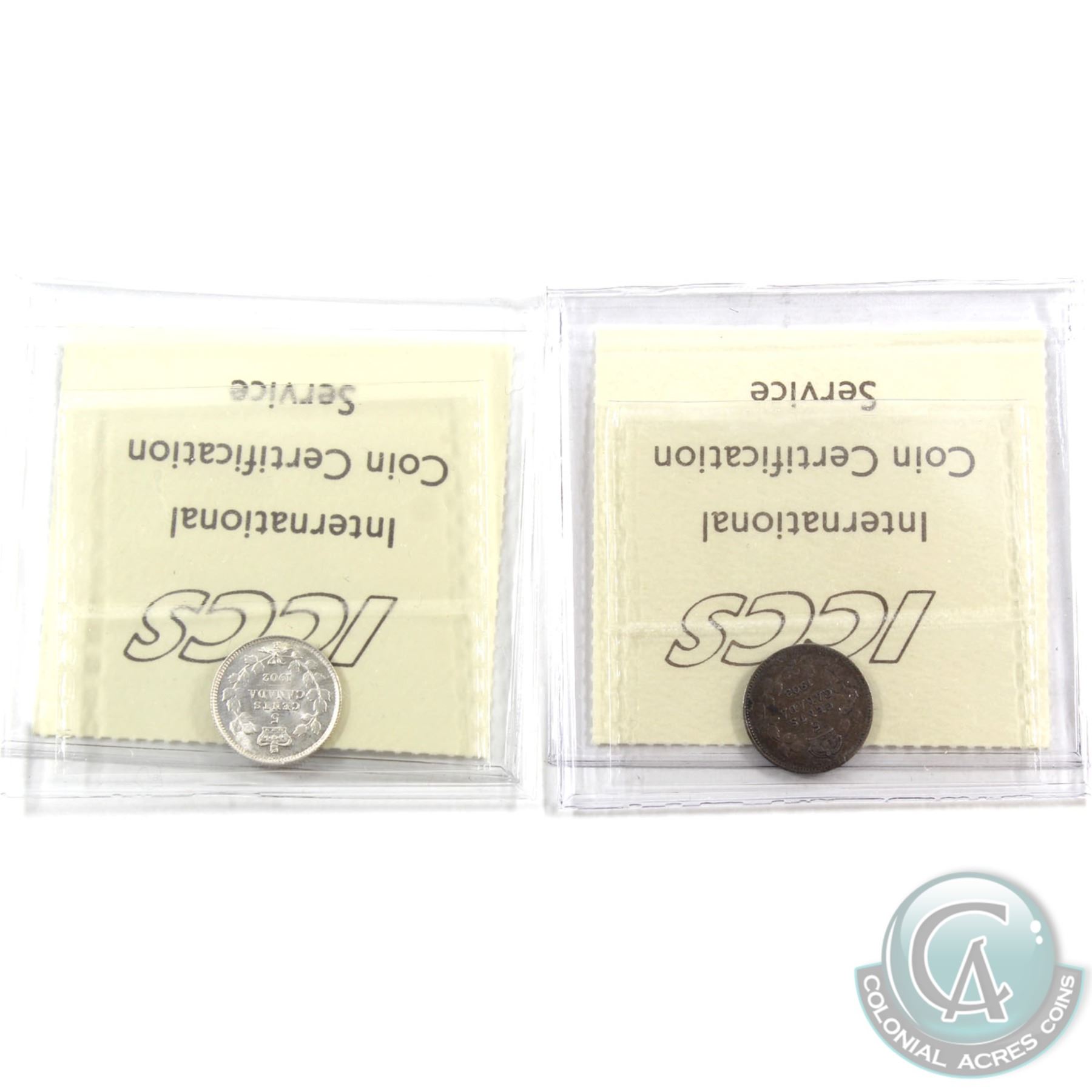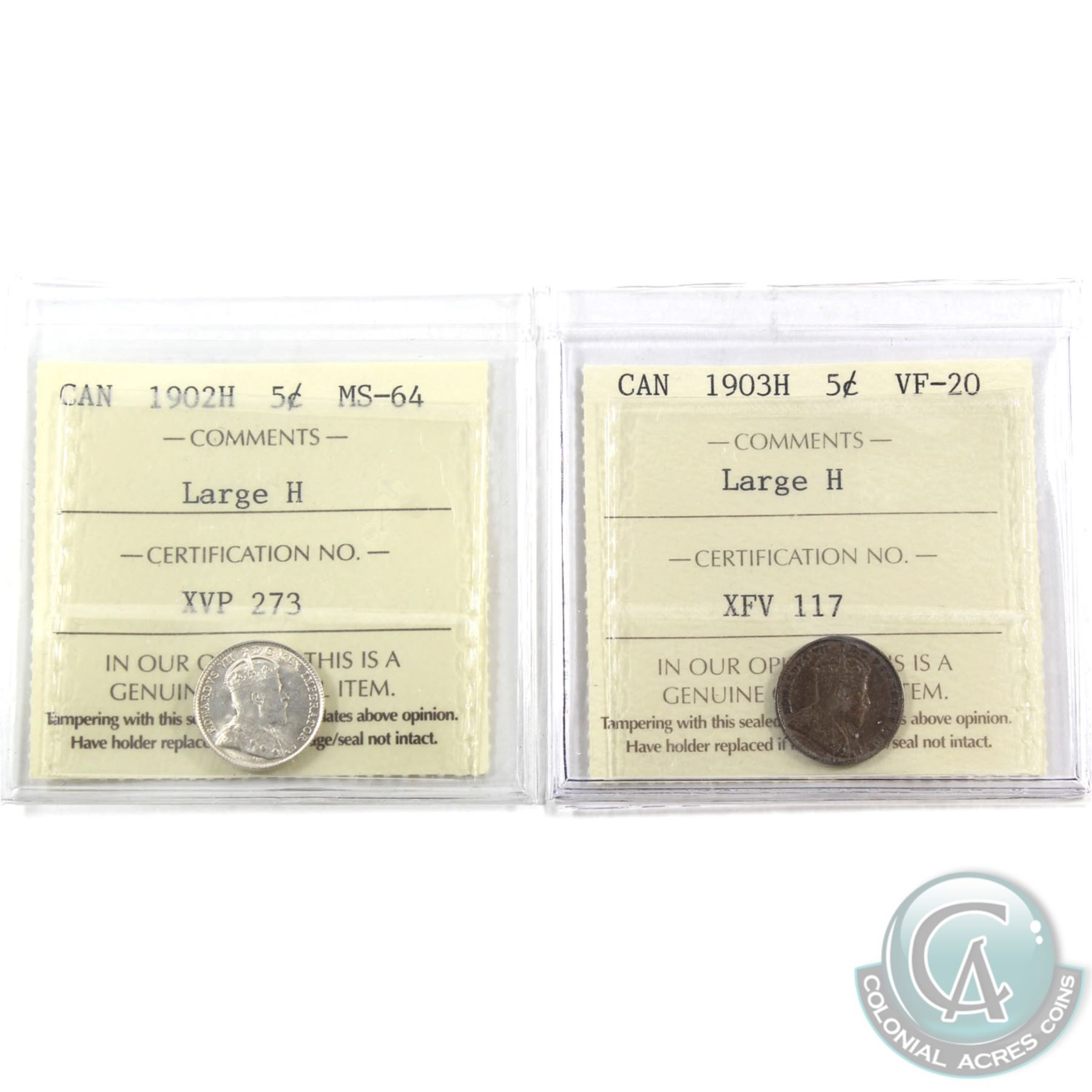 5-cent 1902H Large H ICCS MS-64 & 1903H Large H ICCS VF-20. 2pcs