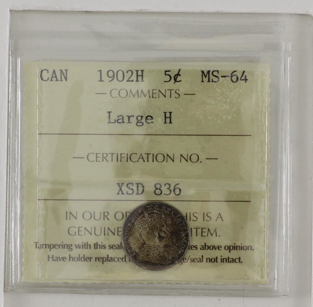 5-cent 1902H Large H ICCS MS64. Beautiful toning!