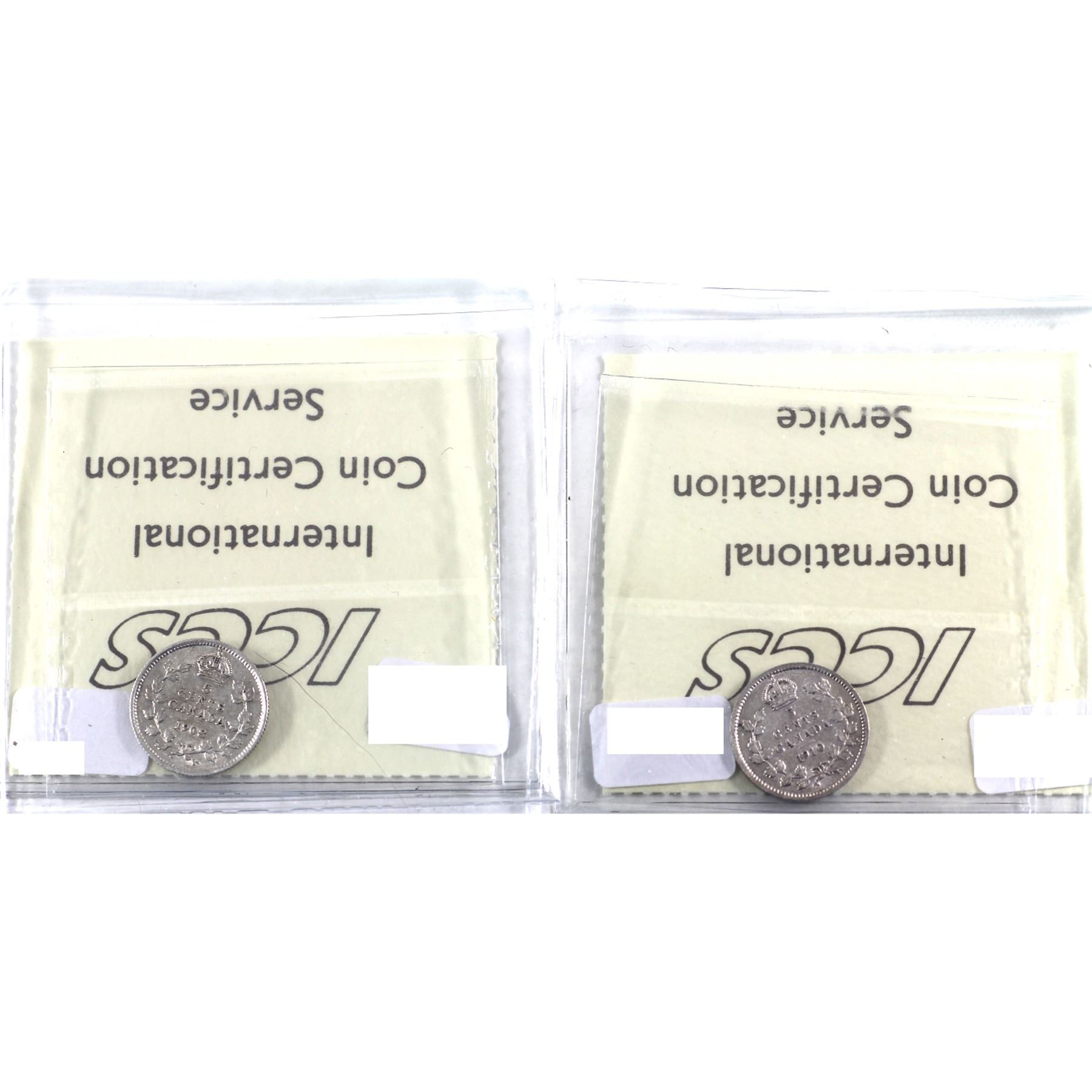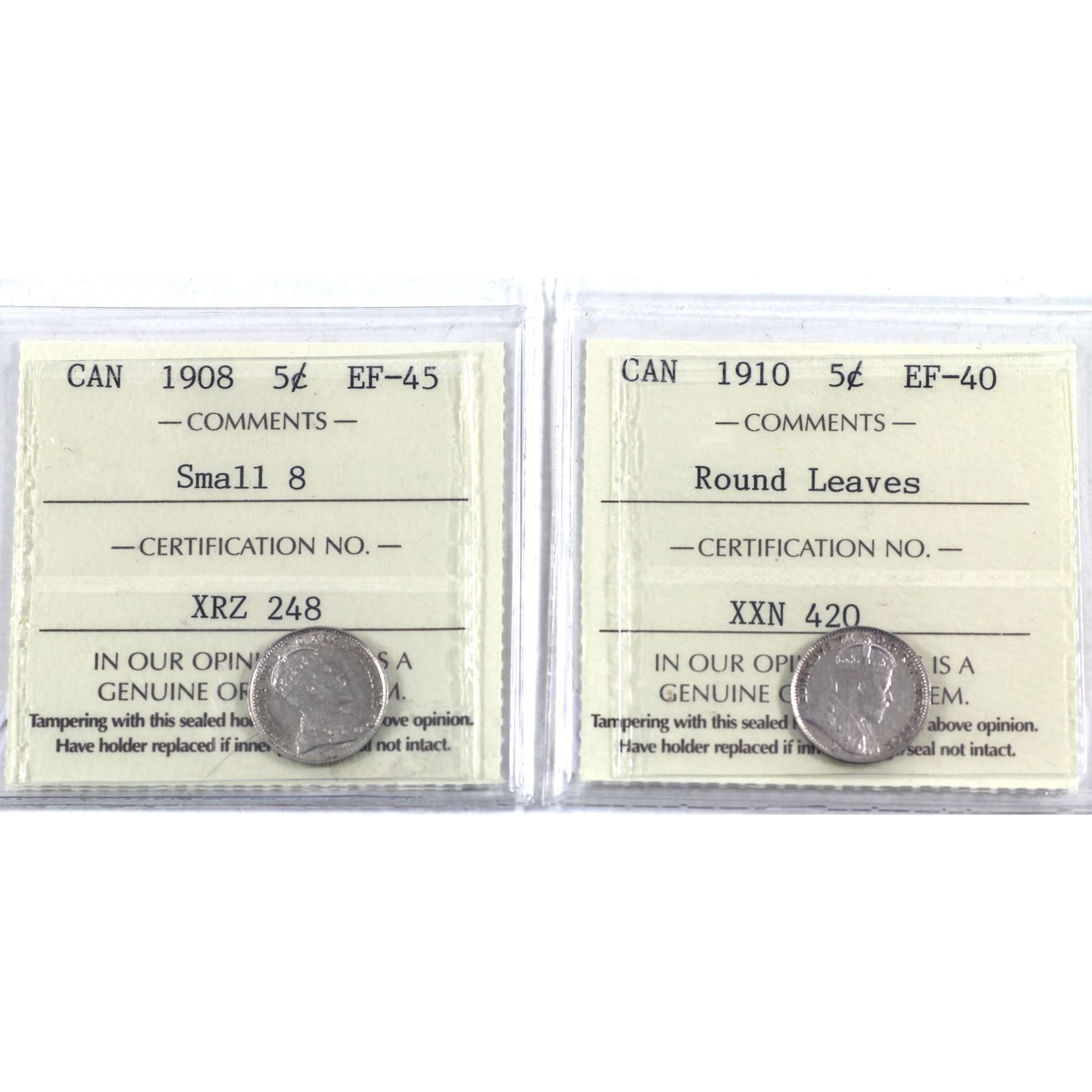 5-cent 1908 Small 8 EF-45 & 1910 Round Leaves EF-40. Both coins are ICCS Certified. 2pcs.