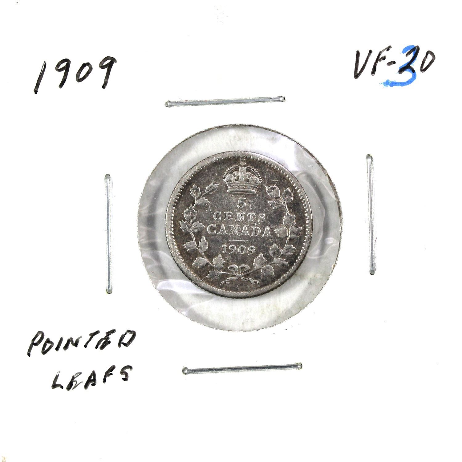 5-cent 1909 Pointed Leaves VF30. Soft Mauve Toning