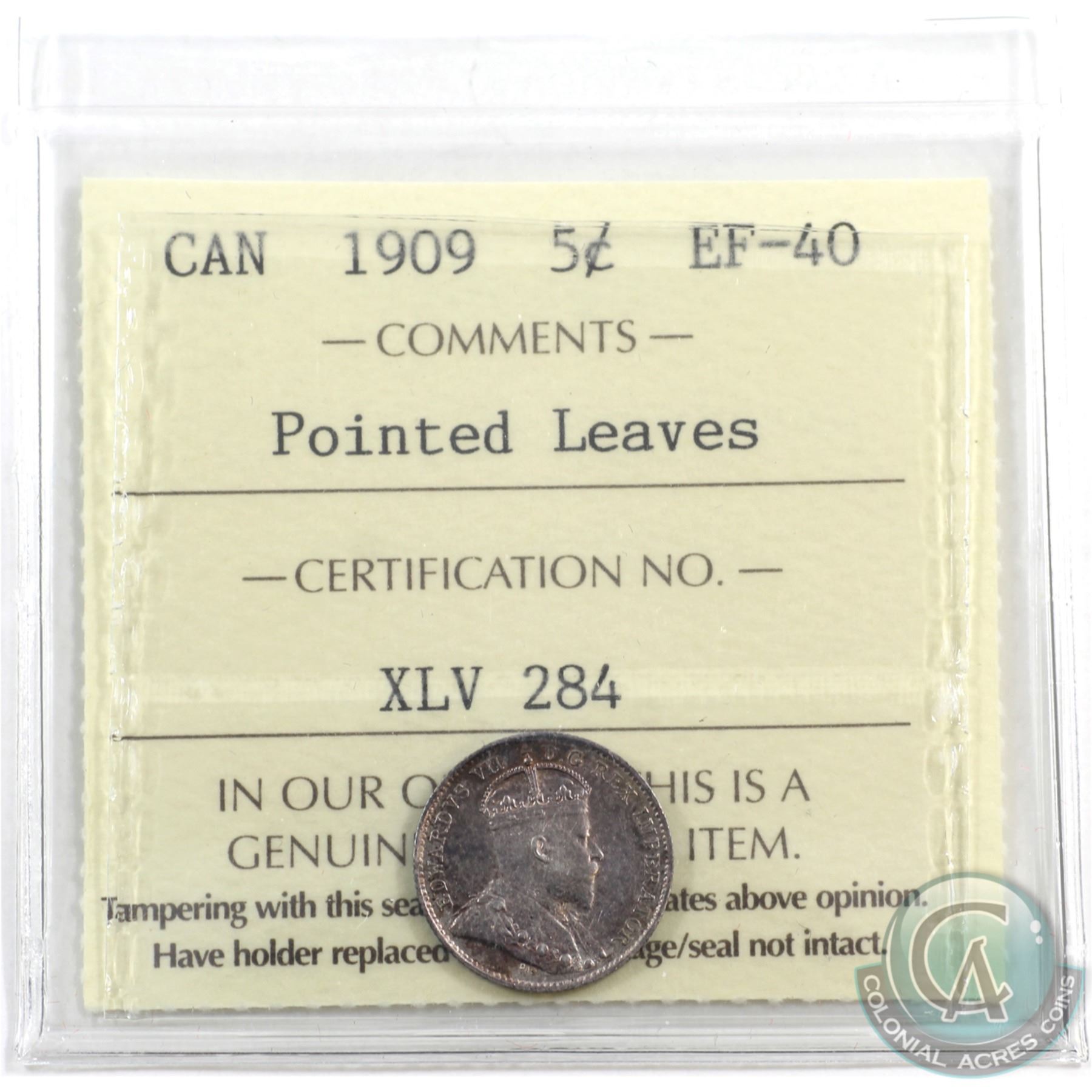 5-cent 1909 Pointed Lvs ICCS Certified EF-40