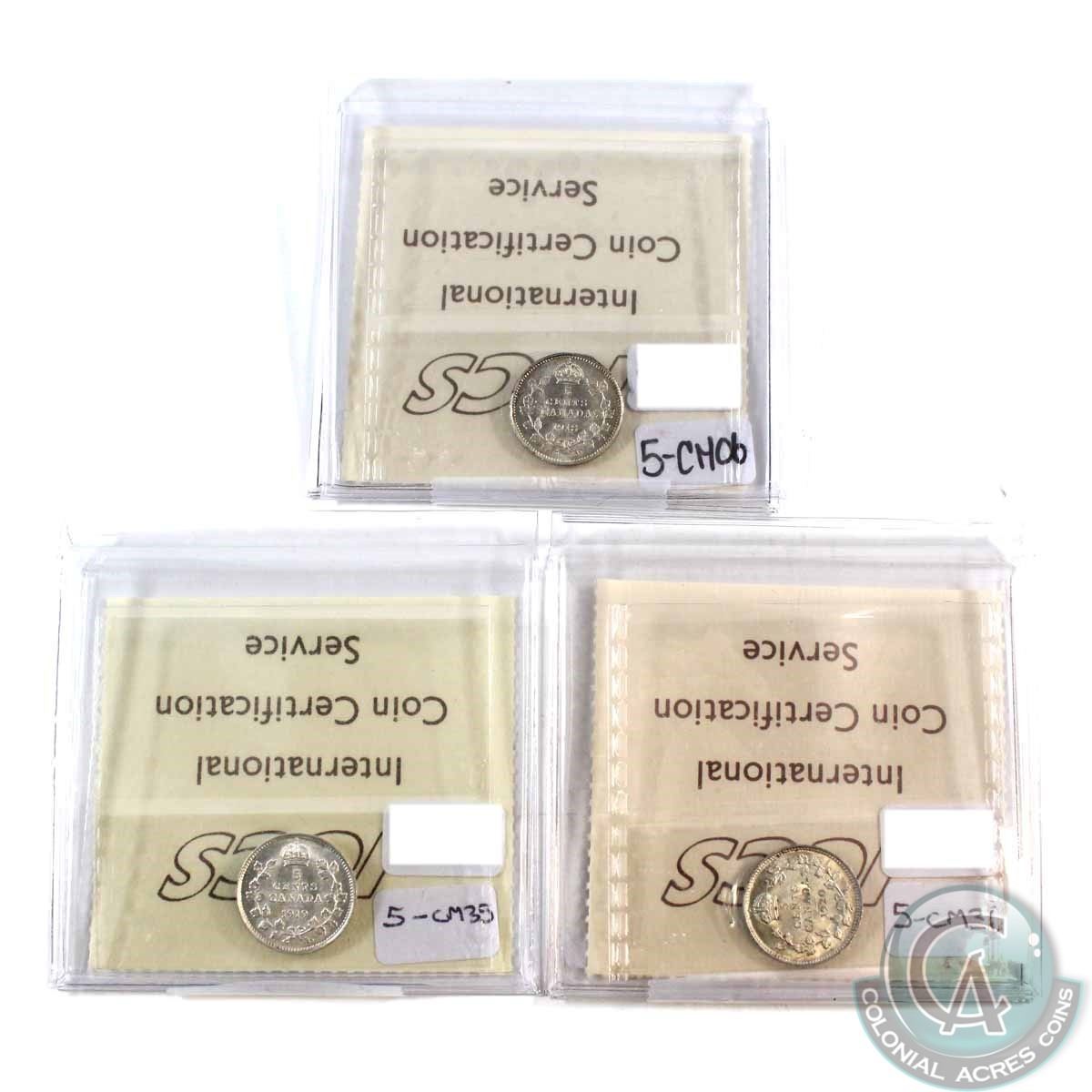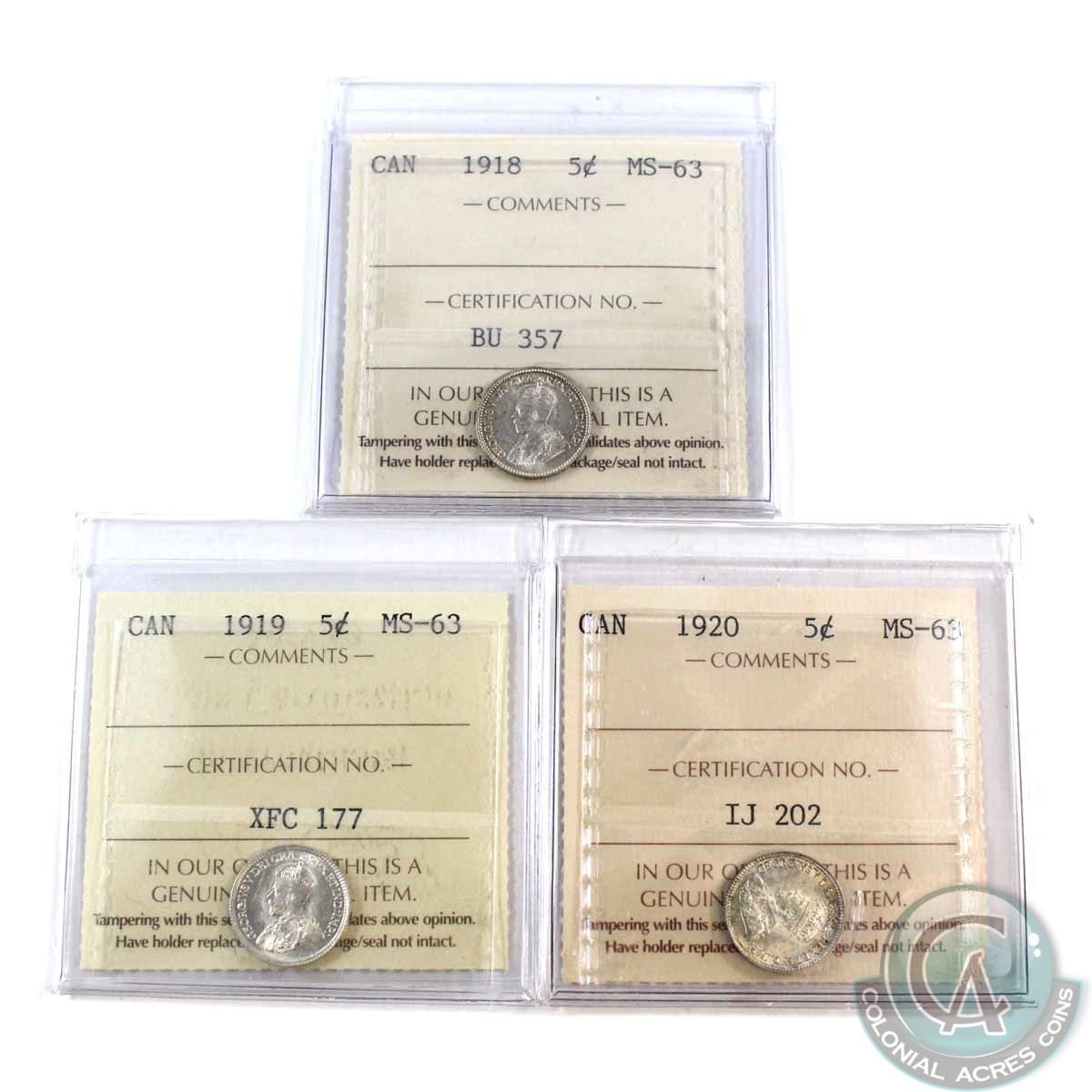 5-cent 1918, 1919 & 1920 ICCS Certified MS-63. 3pcs