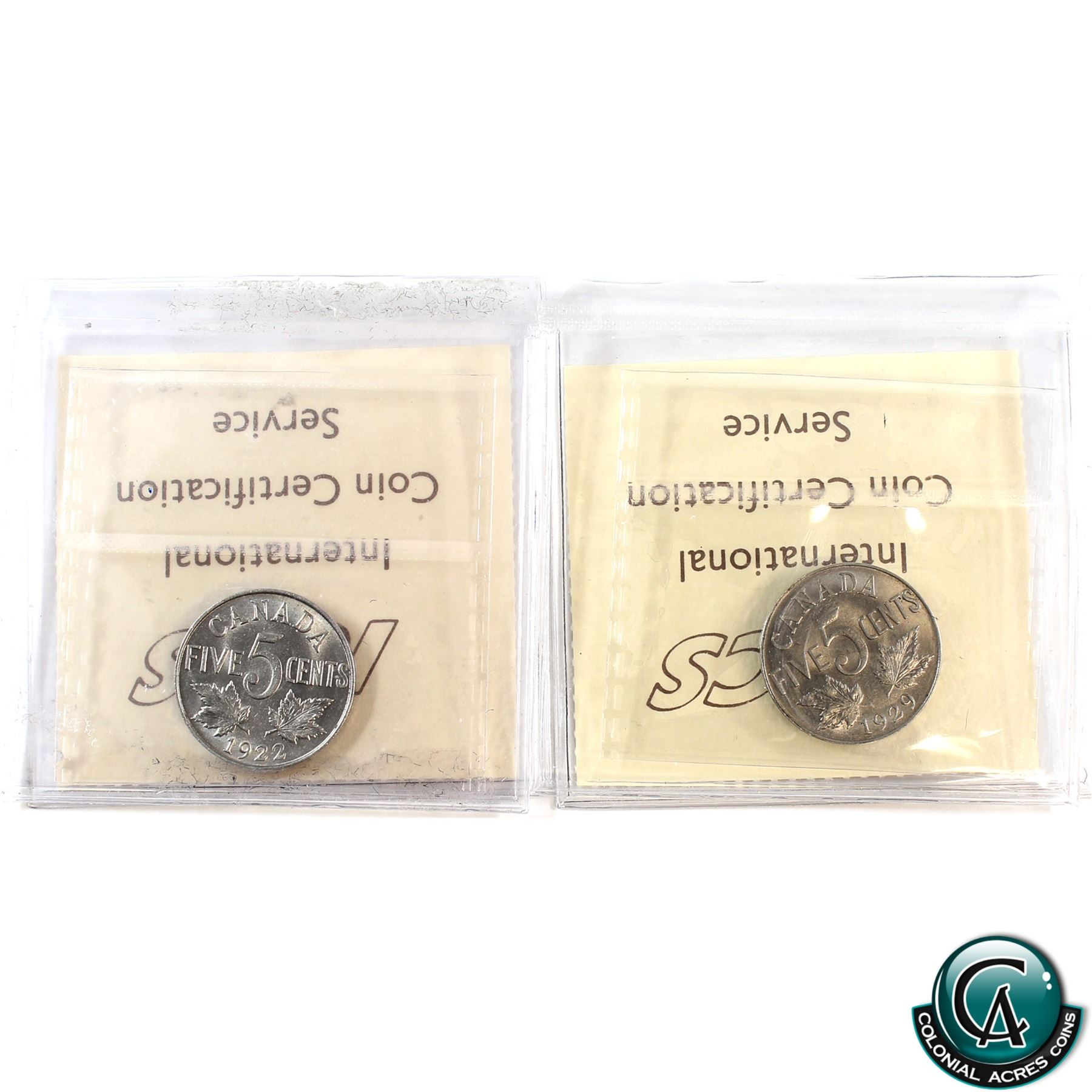 5-cent 1922 & 1929 ICCS Certified MS-62. 2pcs