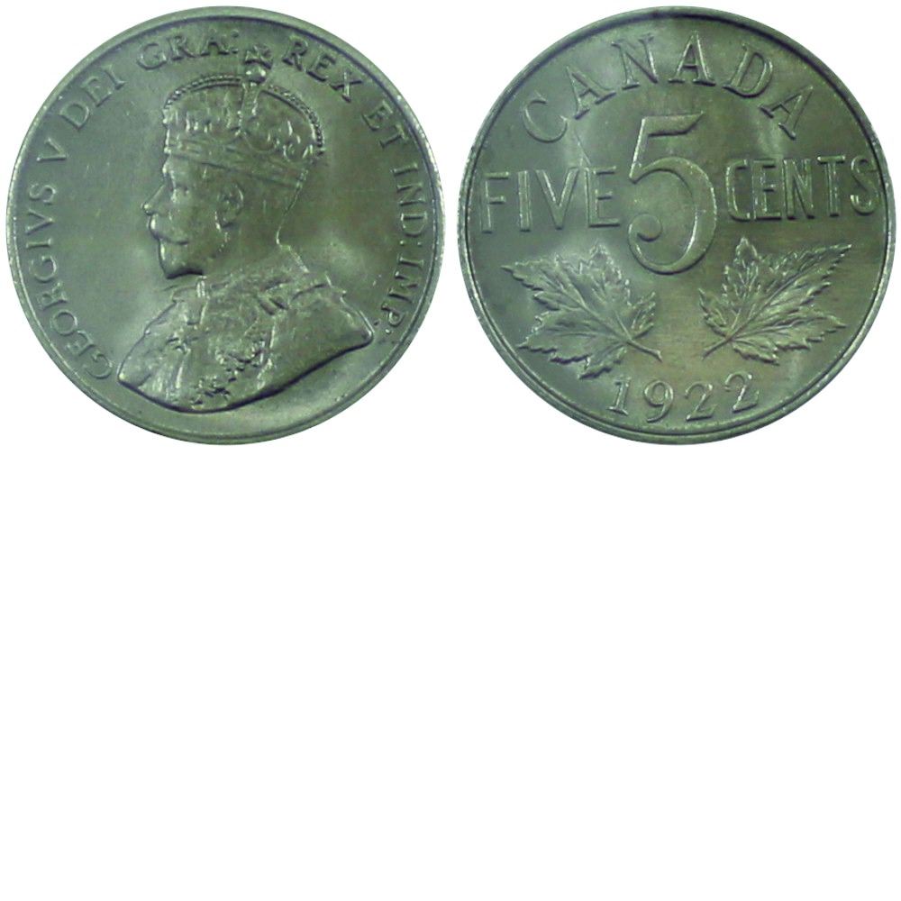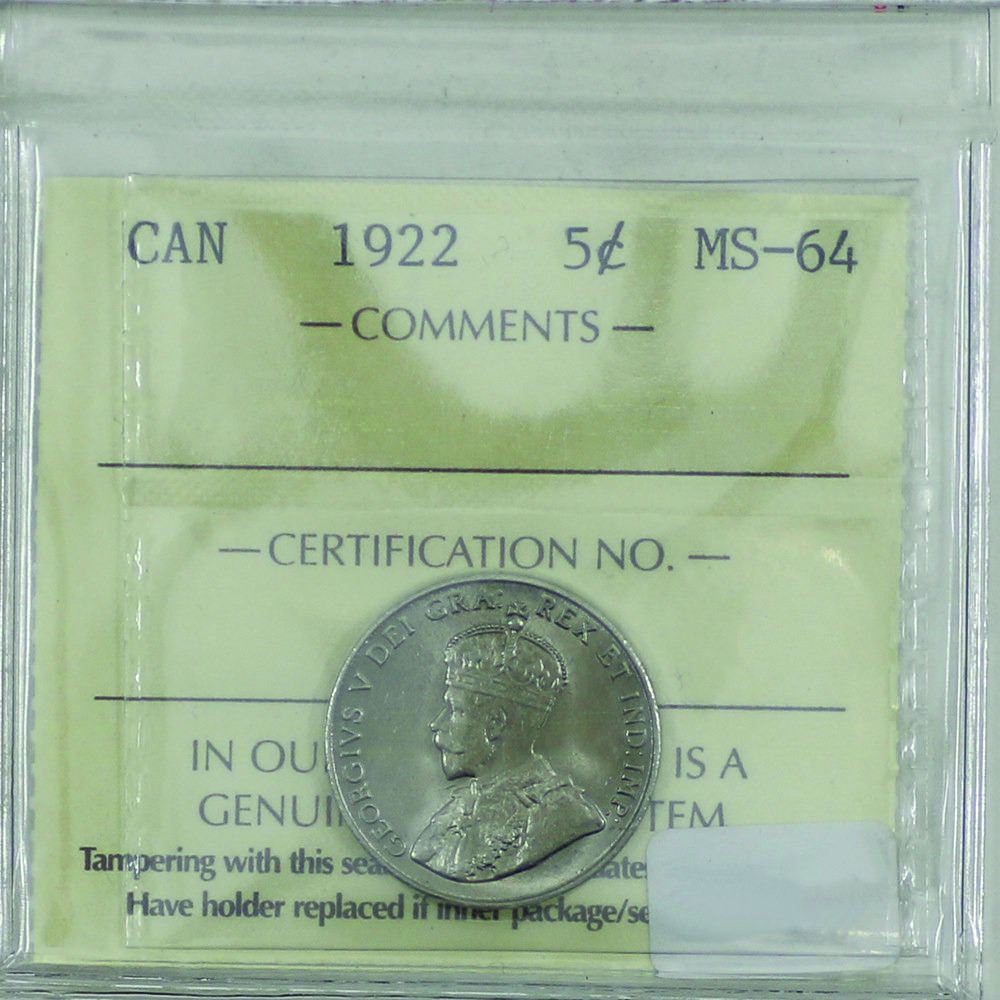 5-cent 1922 ICCS Certified MS-64. A nice mint state example with Caramel Luster.