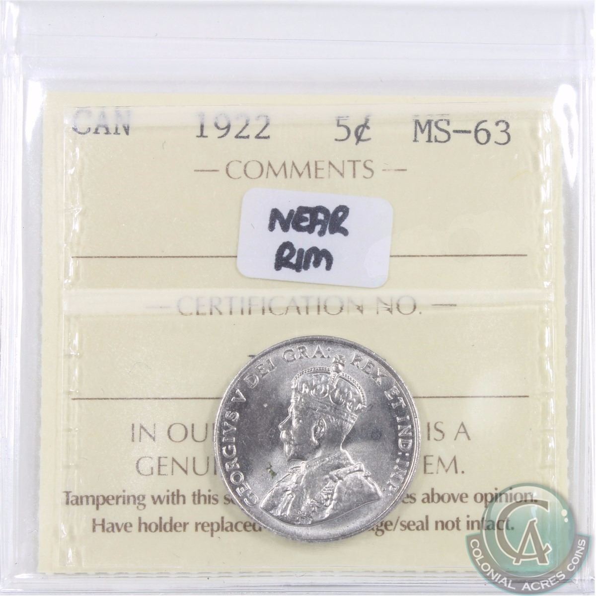 5-cent 1922 Near Rim ICCS Certified MS-63