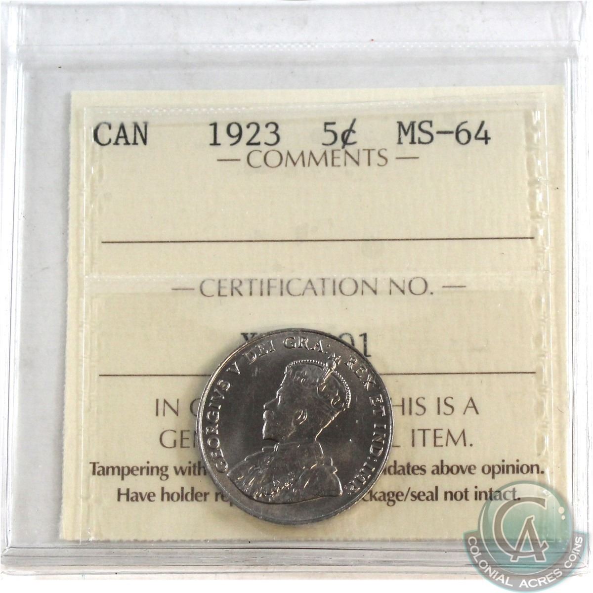 5-cent 1923 ICCS Certified MS-64. A nicely struck coin with attractive rolling Mint Luster.