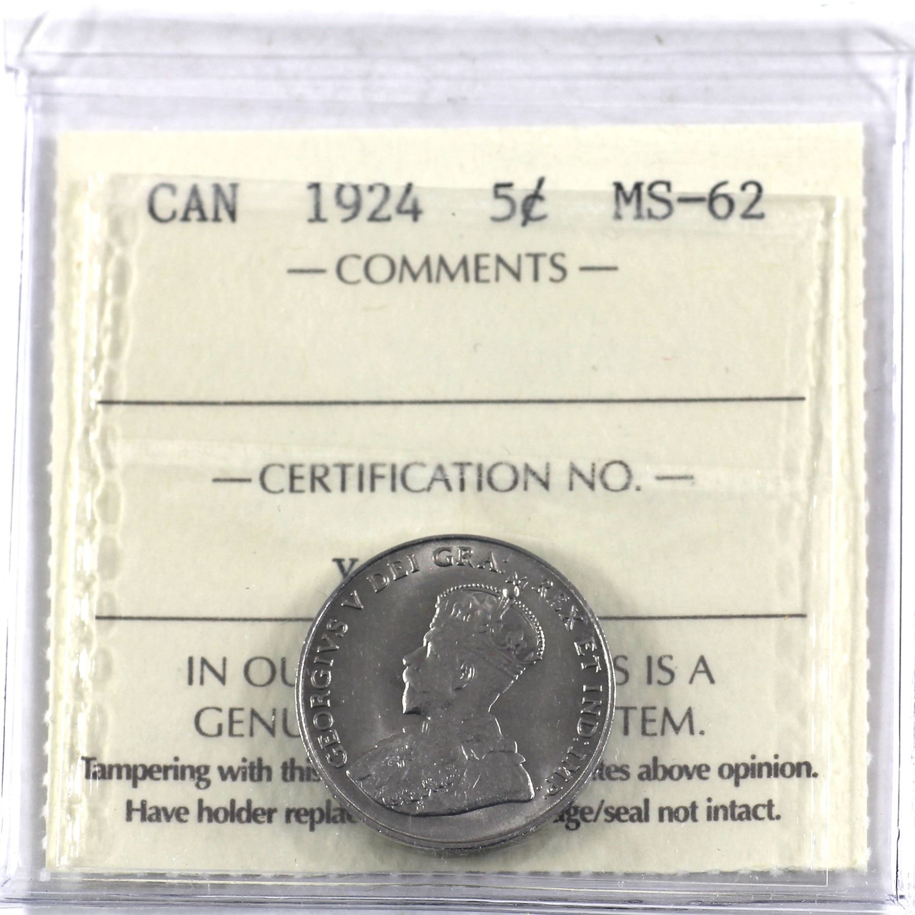 5-cent 1924 ICCS Certified MS-62.