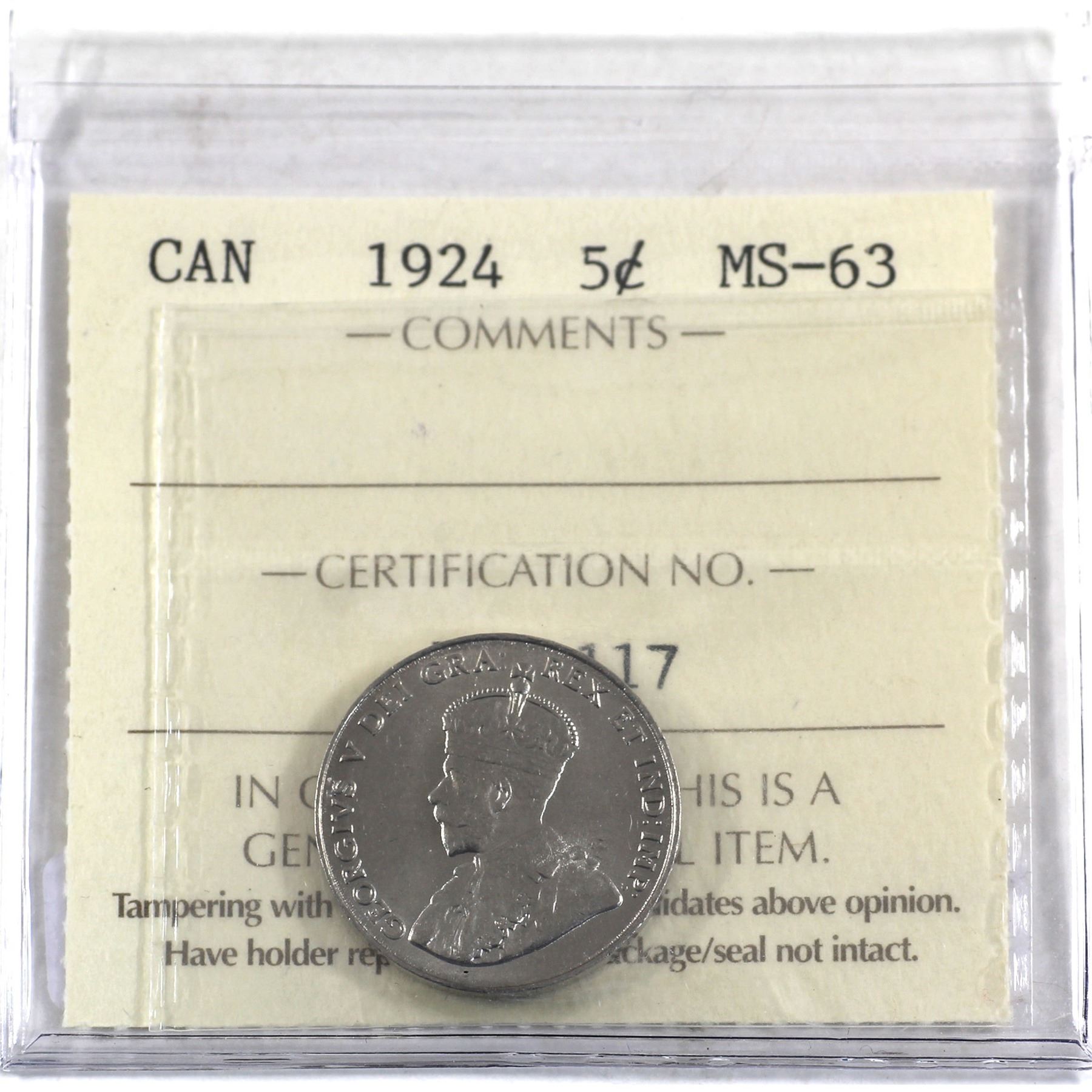 5-cent 1924 ICCS Certified MS-63.