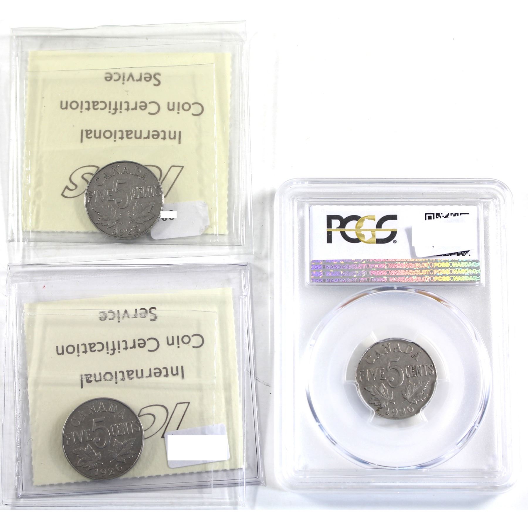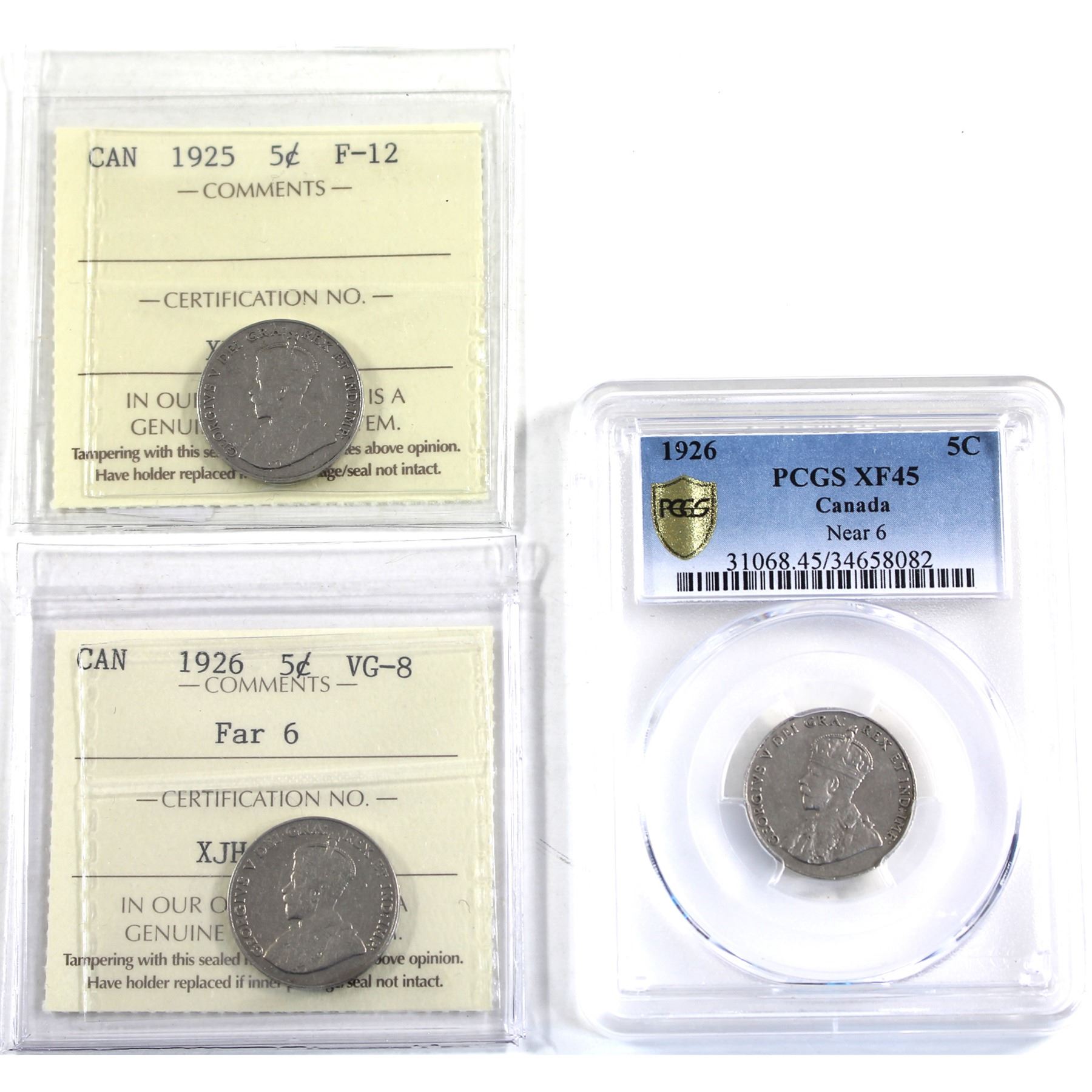 5-cent 1925 F-12, 1926 Far 6, VG-8 & 1926 Near 6 XF-45 All Certified (ICCS & PCGS) A great lot for someone looking to fill the holes in their 5-cent Collection.