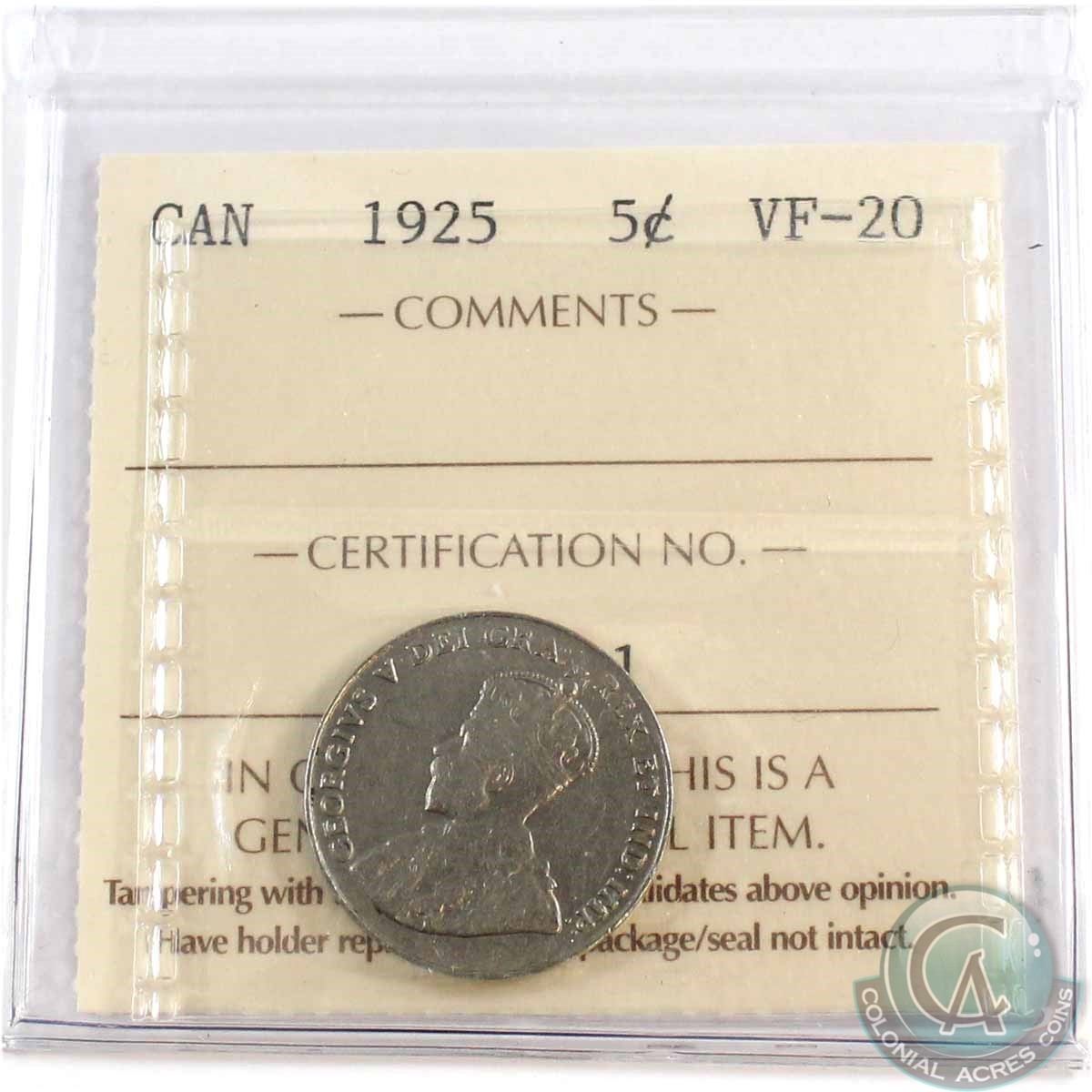 5-cent 1925 ICCS Certified VF-20. *Key Date*