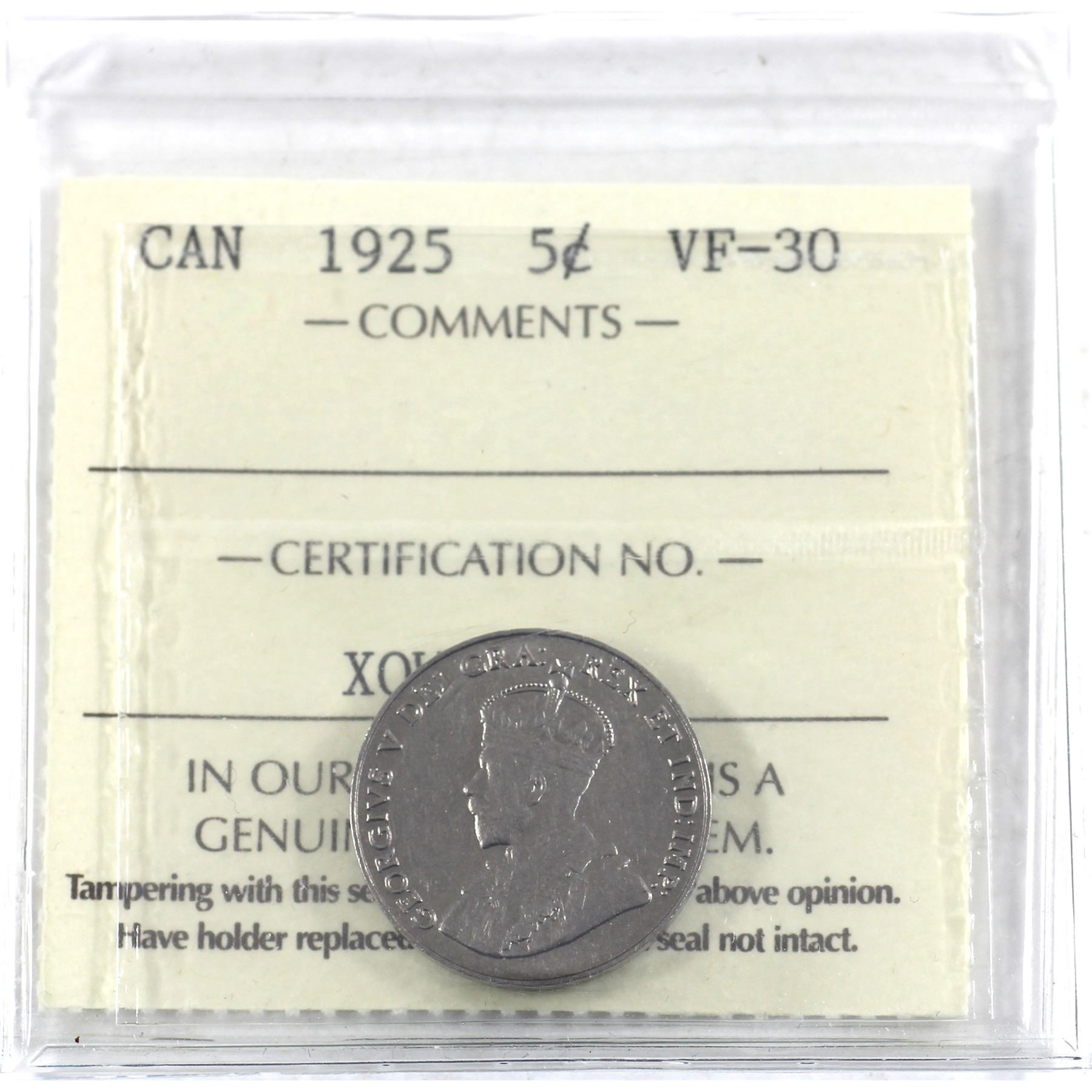 5-cent 1925 ICCS Certified VF-30.