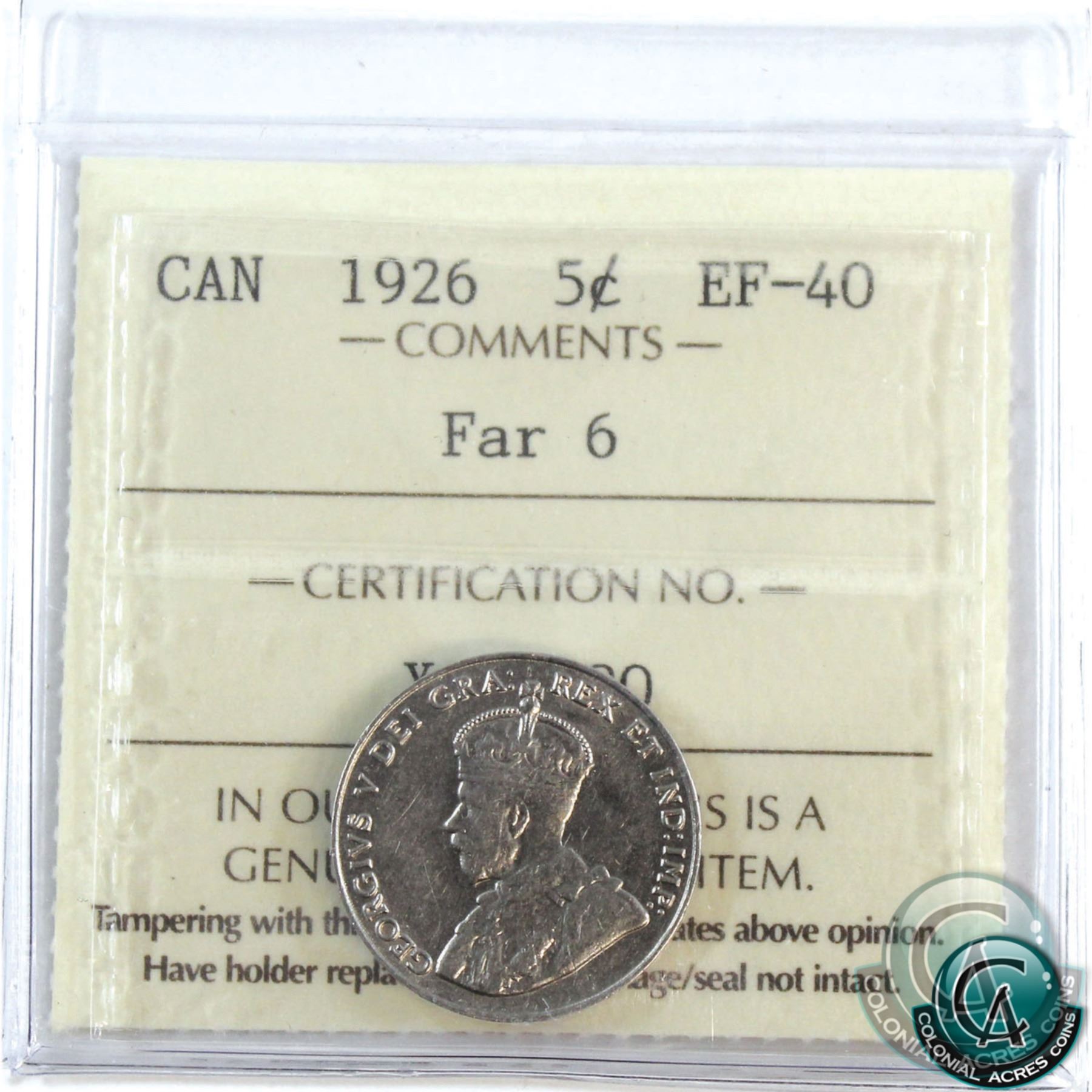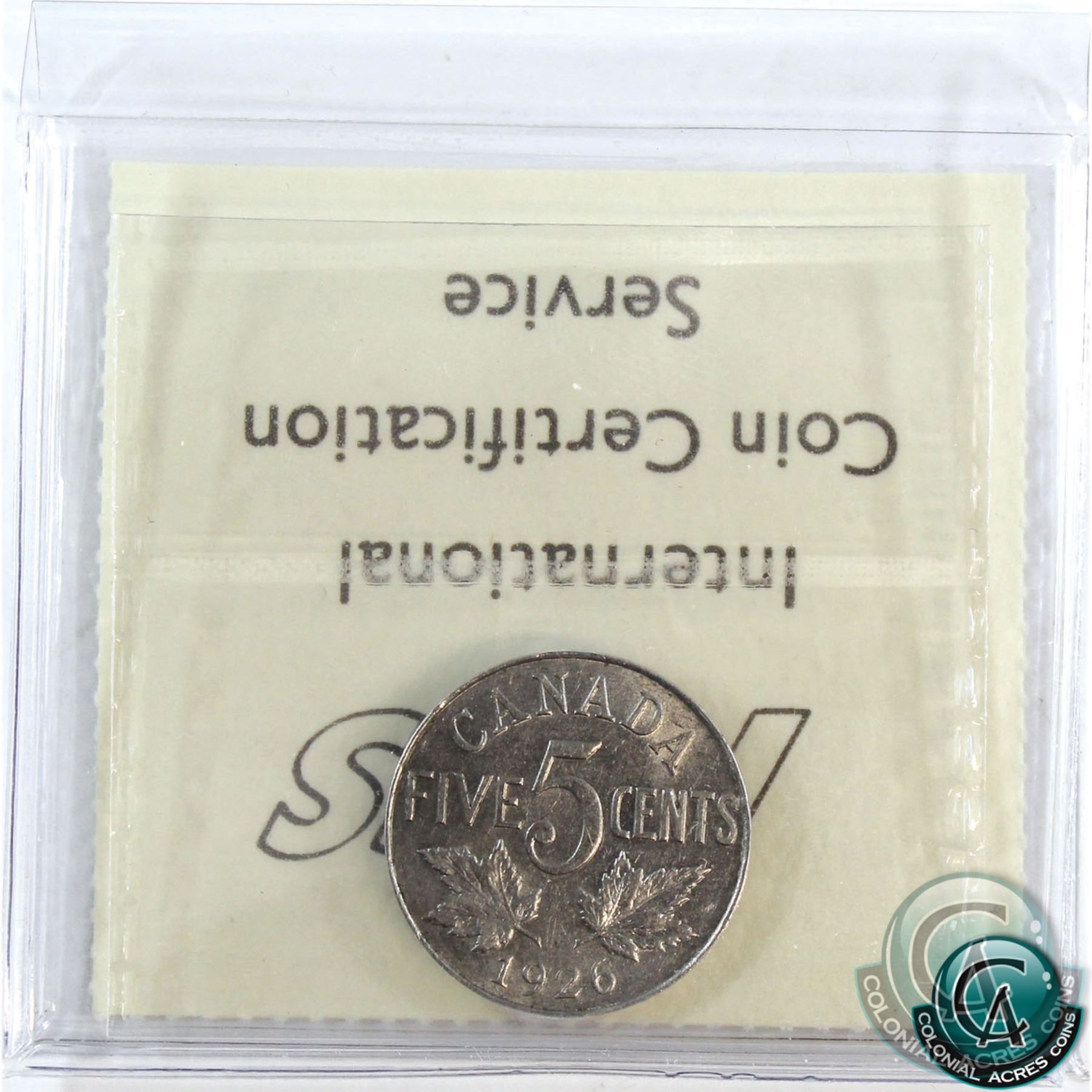 5-cent 1926 Far 6 ICCS Certified EF-40. Mid-grade example of a scarce variety.