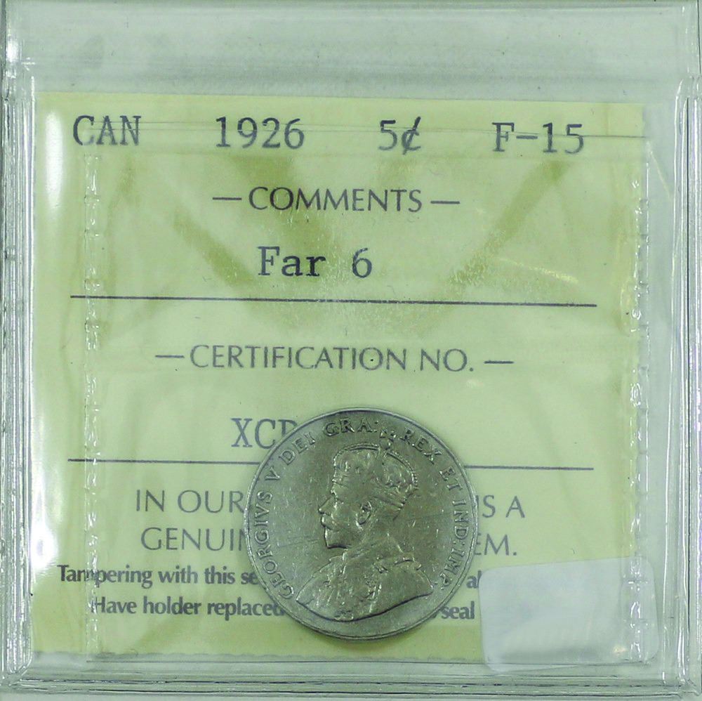 5-cent 1926 Far 6, ICCS Certified F-15. *Key Date*