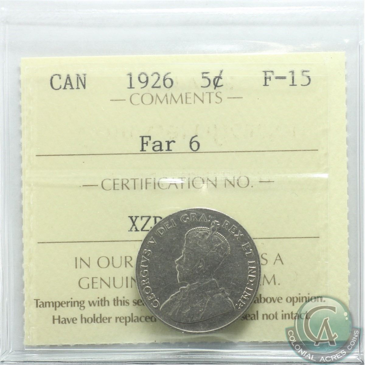 5-cent 1926 Far 6 ICCS Certified F-15