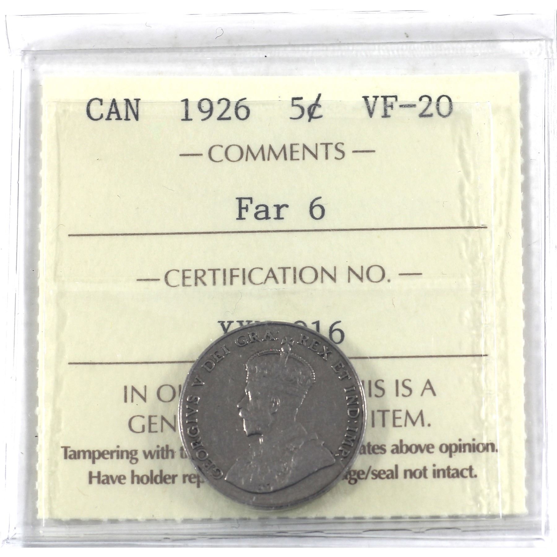 5-cent 1926 Far 6 ICCS Certified VF-20.