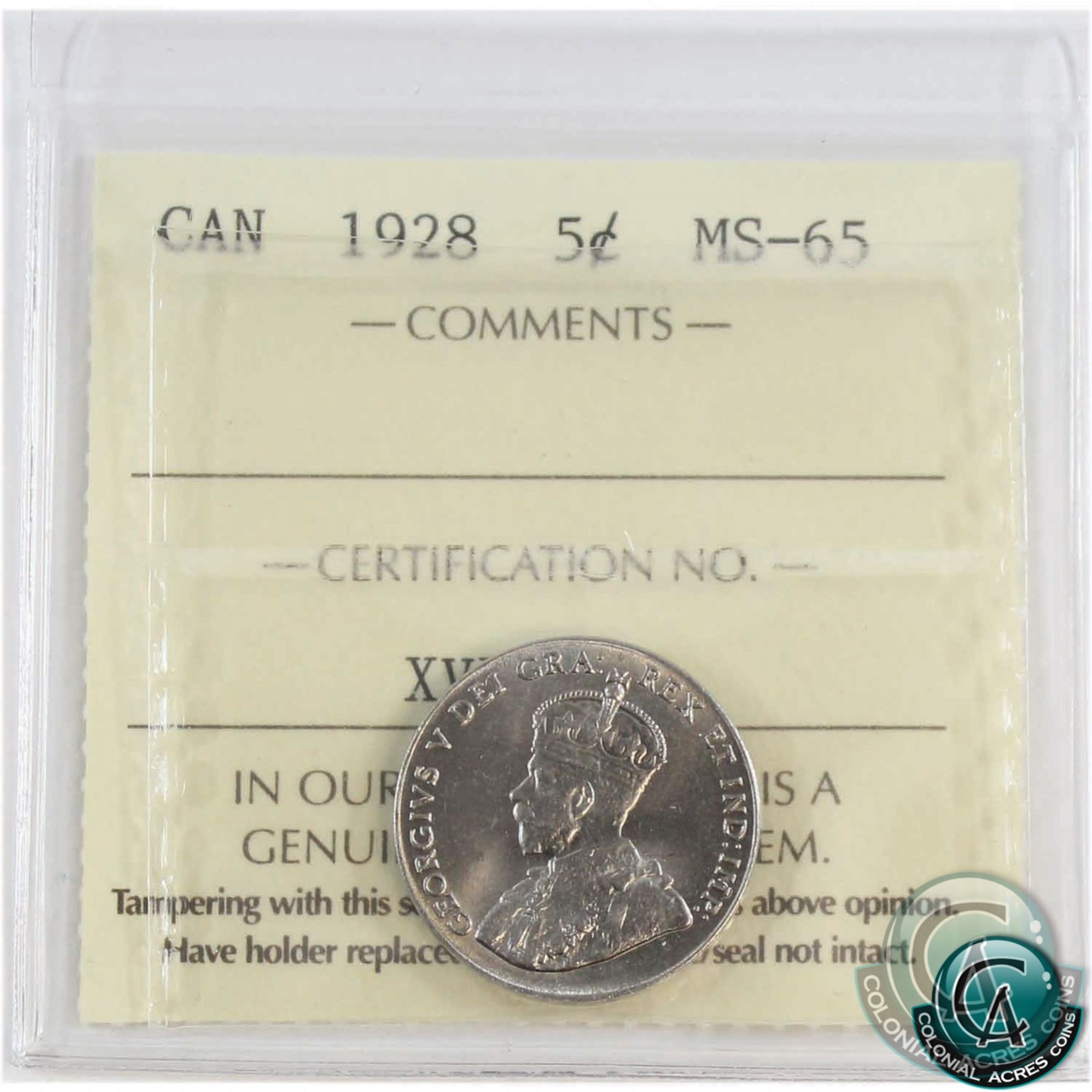 5-cent 1928 ICCS Certified MS-65! Tied for highest grade by ICCS.