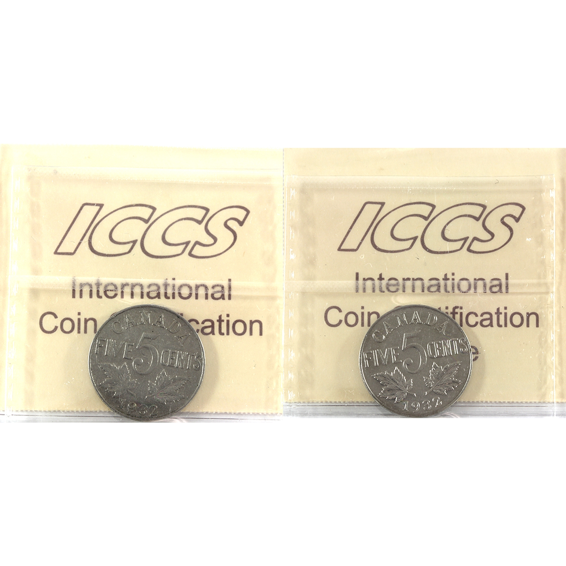 5-cent 1932 Near 2 EF45, & 1932 Far 2 VF20 ICCS. 2pcs.