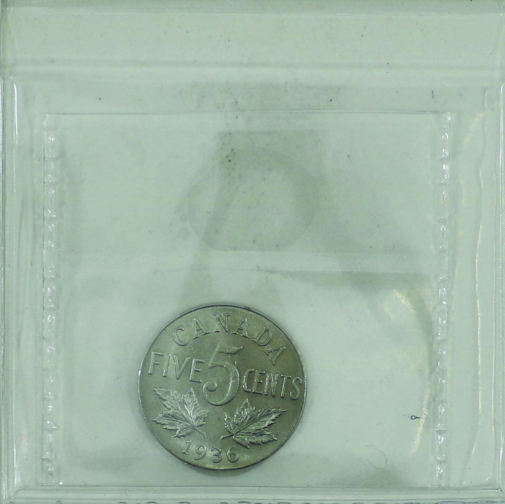 5-cent 1936 ICCS Certified MS-63. A nice clean example of this last year issue George 5th.