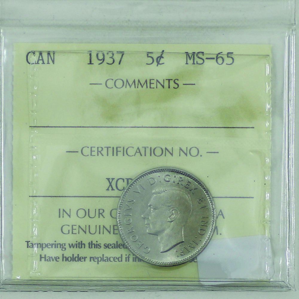 5-cent 1937 ICCS Certified MS-65! An exceptional eye appealing coin with soft marble luster.