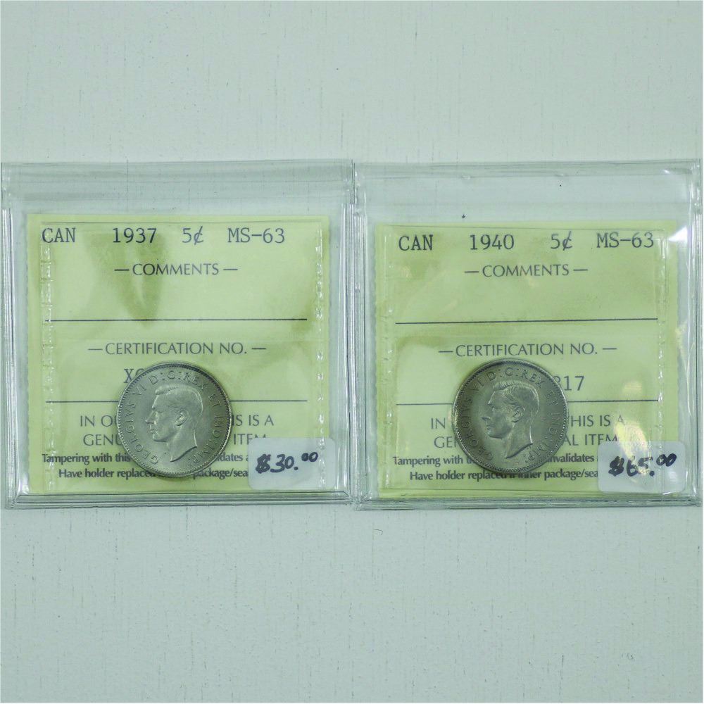 5-cent 1937 ICCS Certified MS63 & 1940 ICCS Certified MS63. 2pcs.