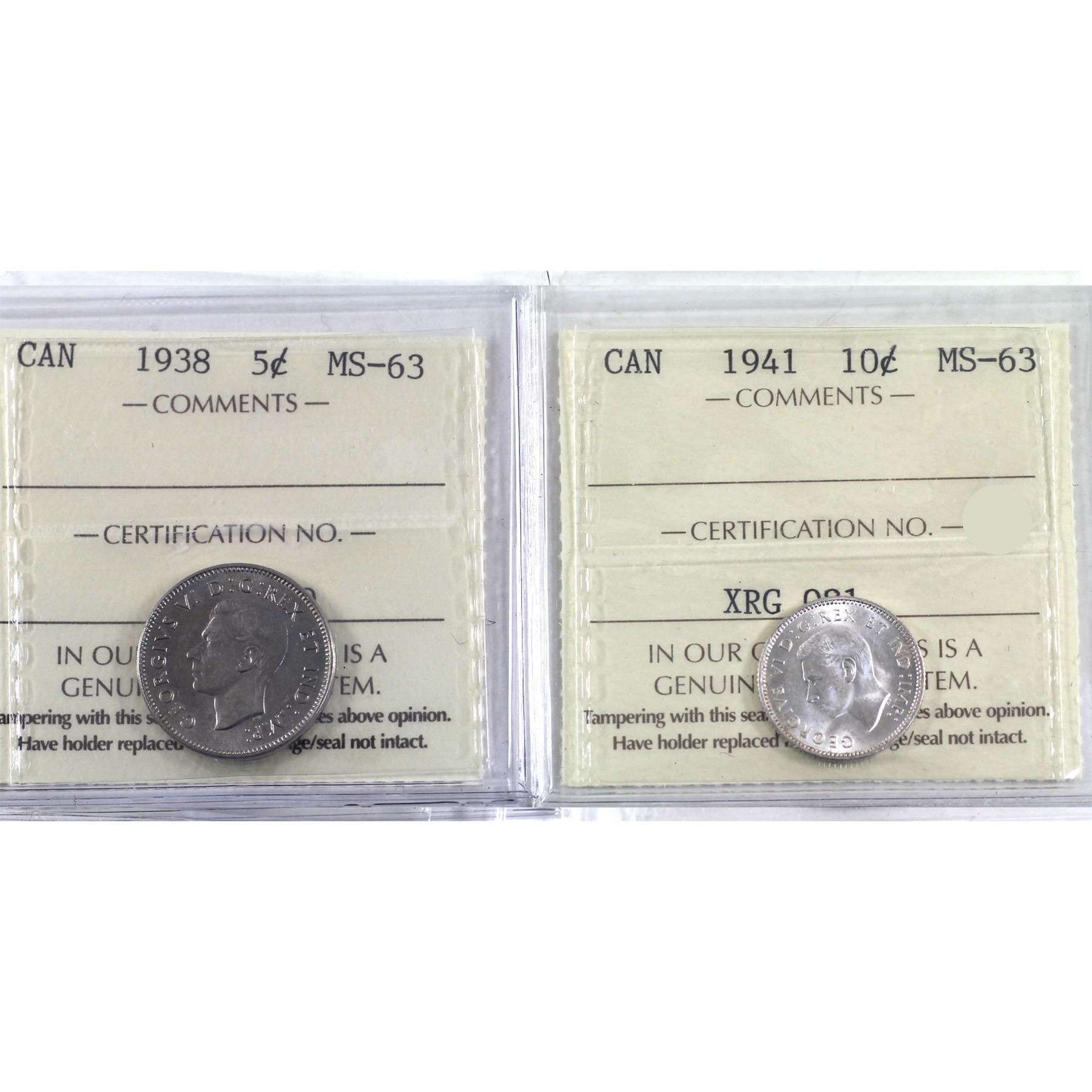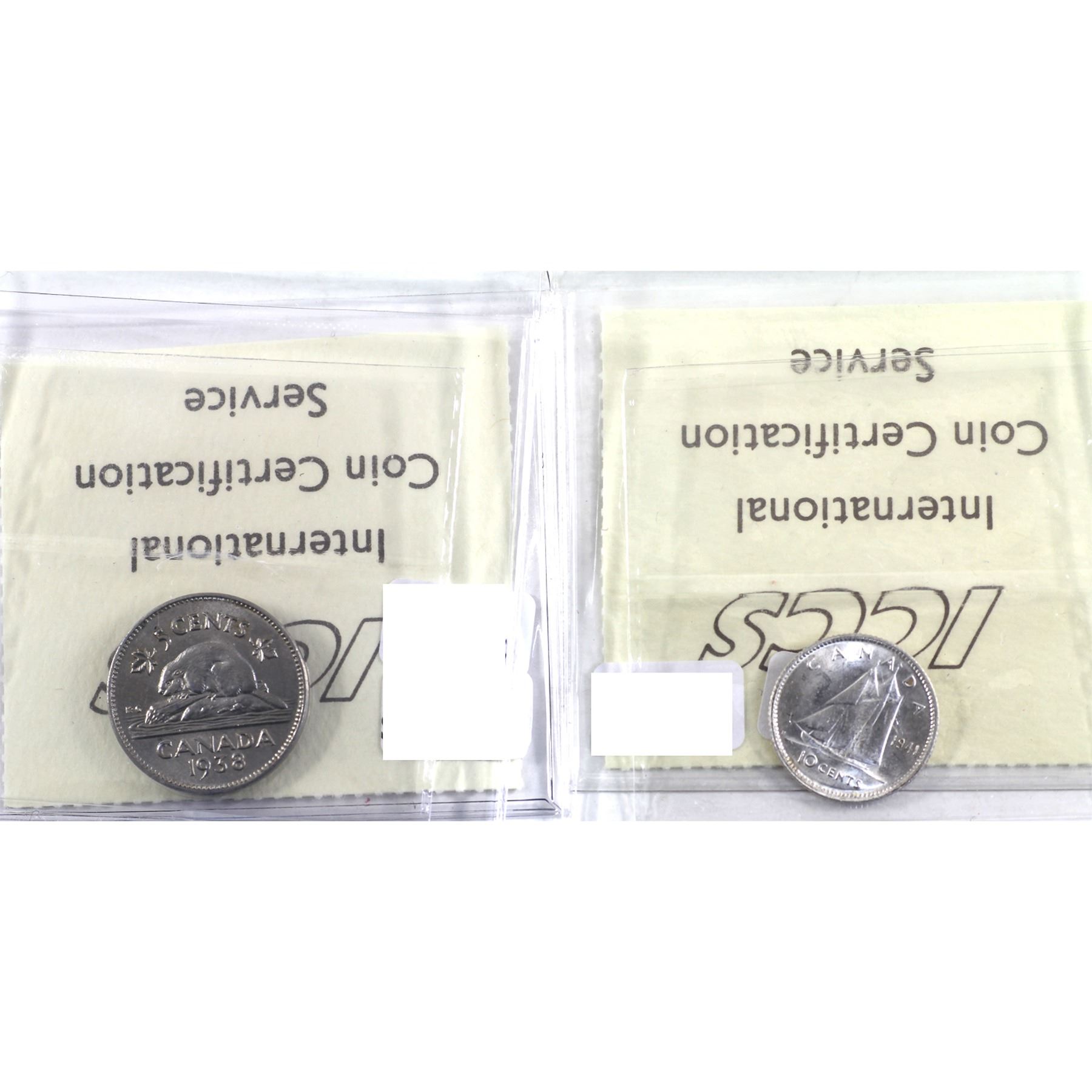 5-cent 1938 & 10-cent 1941 ICCS Certified MS-63. 2pcs.