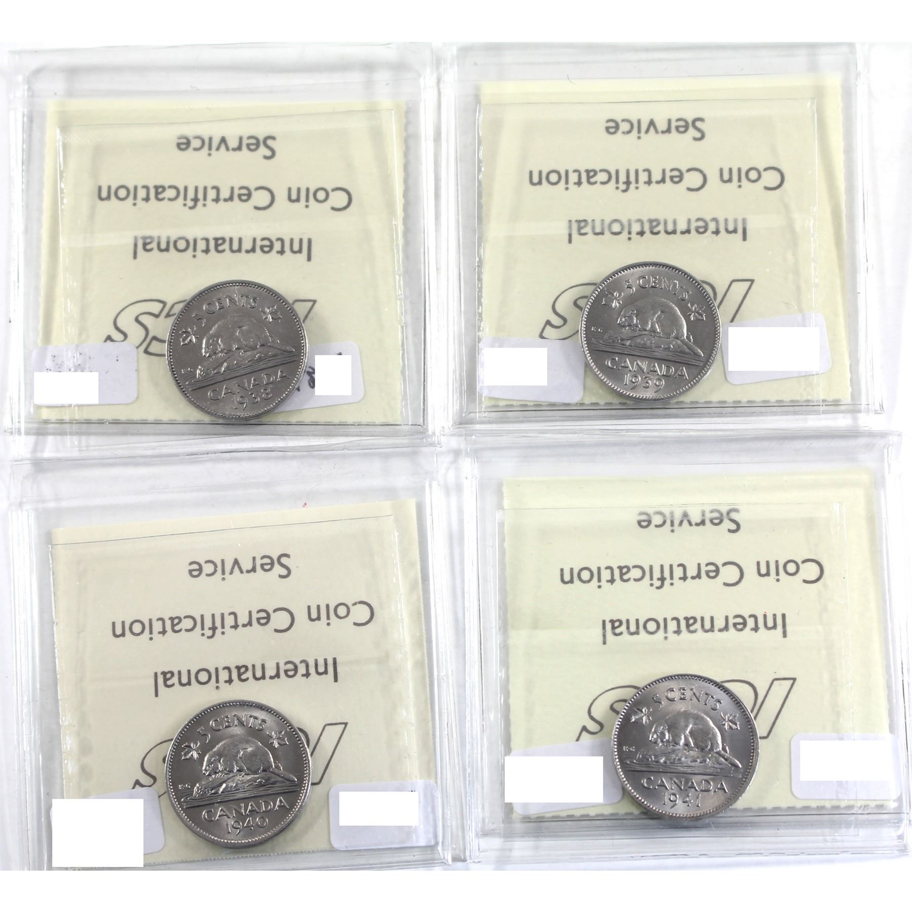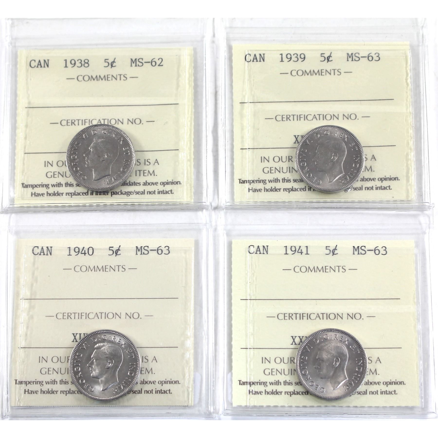 5-cent 1938 MS-62, 1939 MS-63, 1940 MS-63, 1941 MS-63. All coins are ICCS Certified.