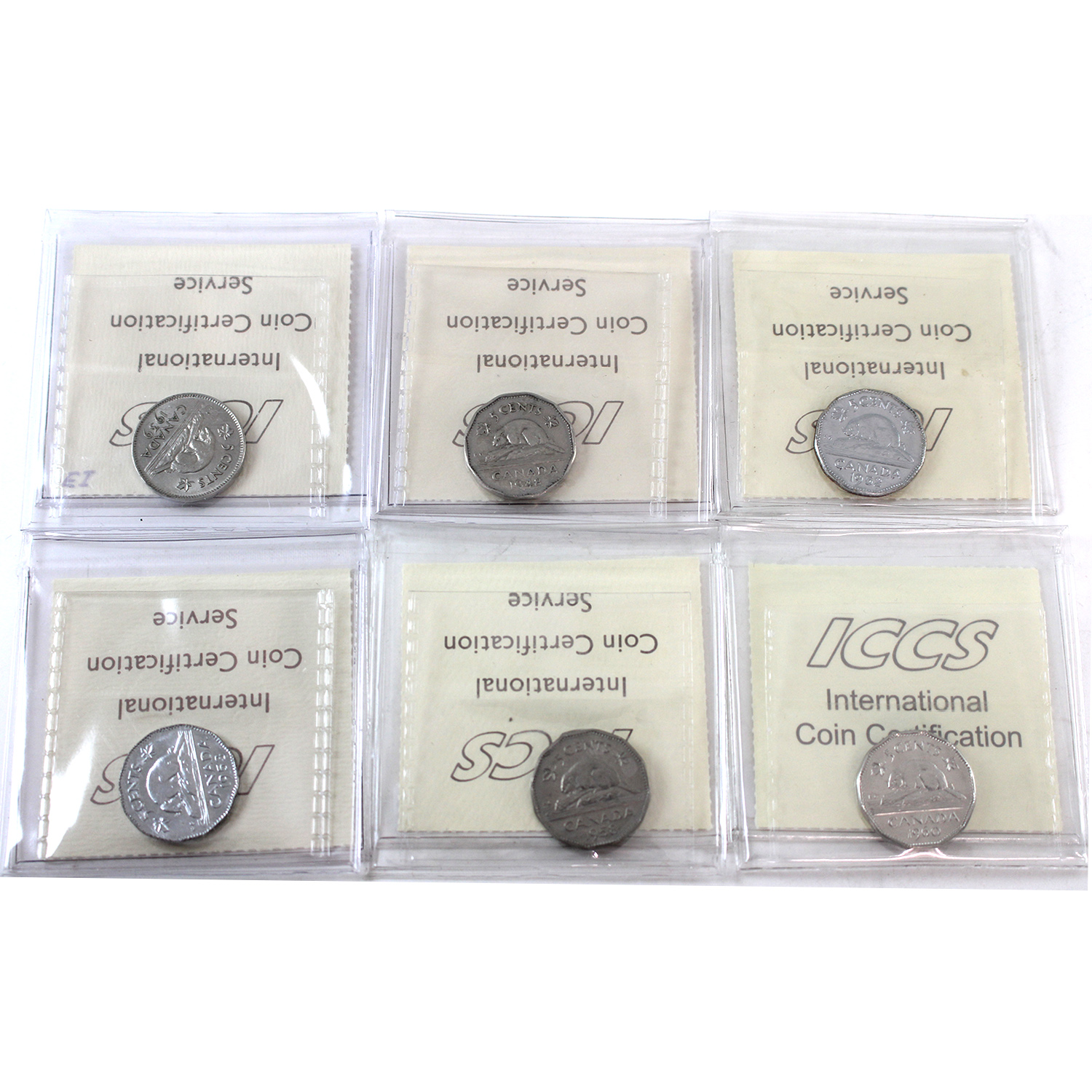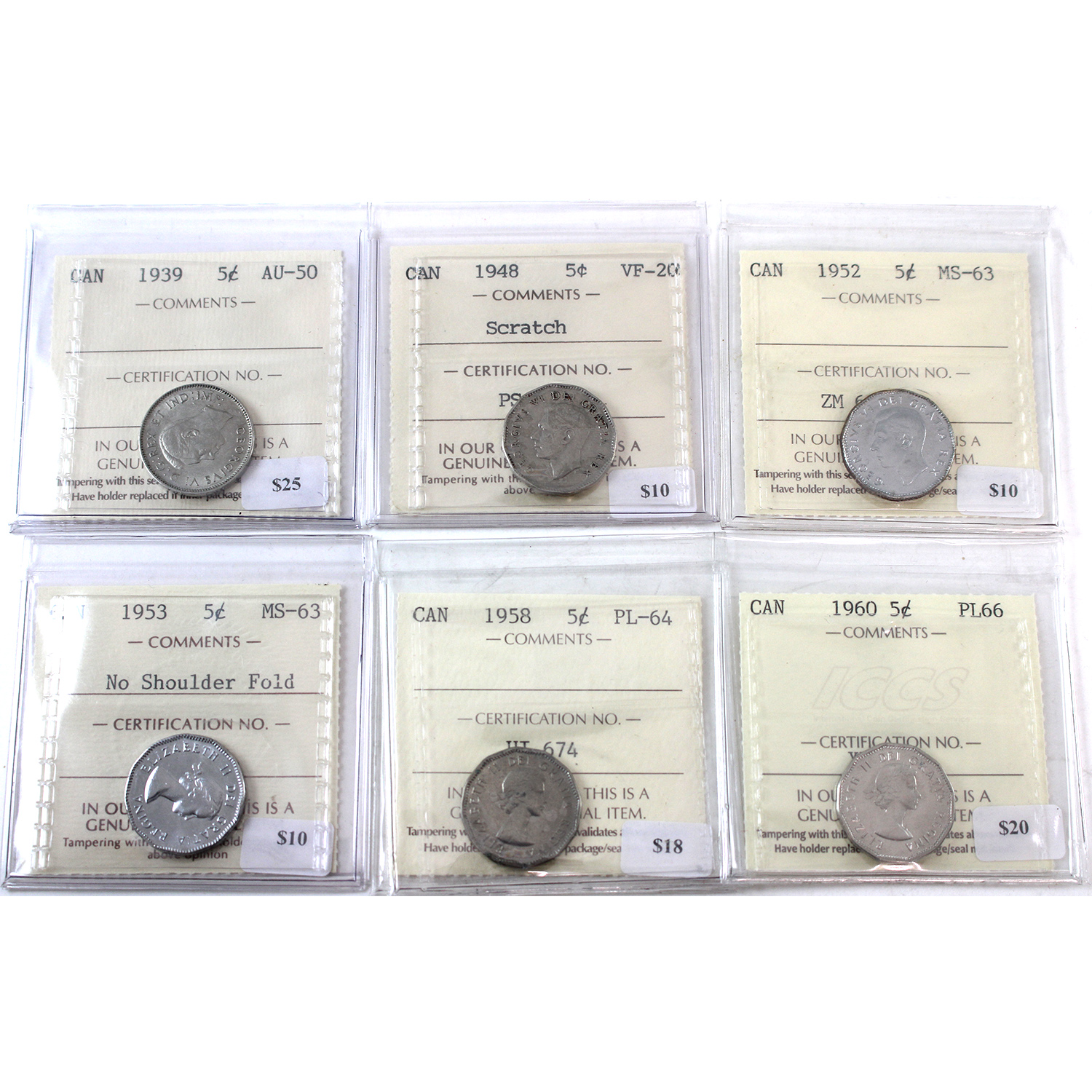 INCLUDES: 1939 AU50, 1948 VF20 (scratch), 1952 MS63, 1953 NSF MS63, 1958 PL64 & 1960 PL66. 6pcs.