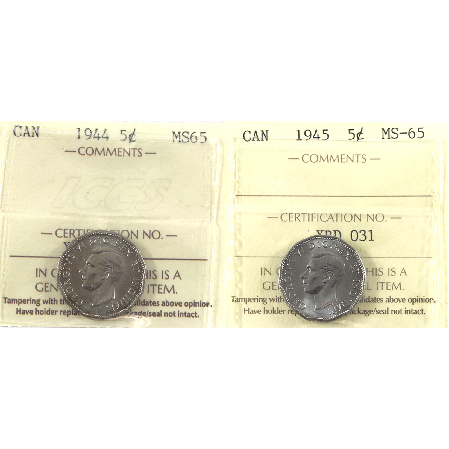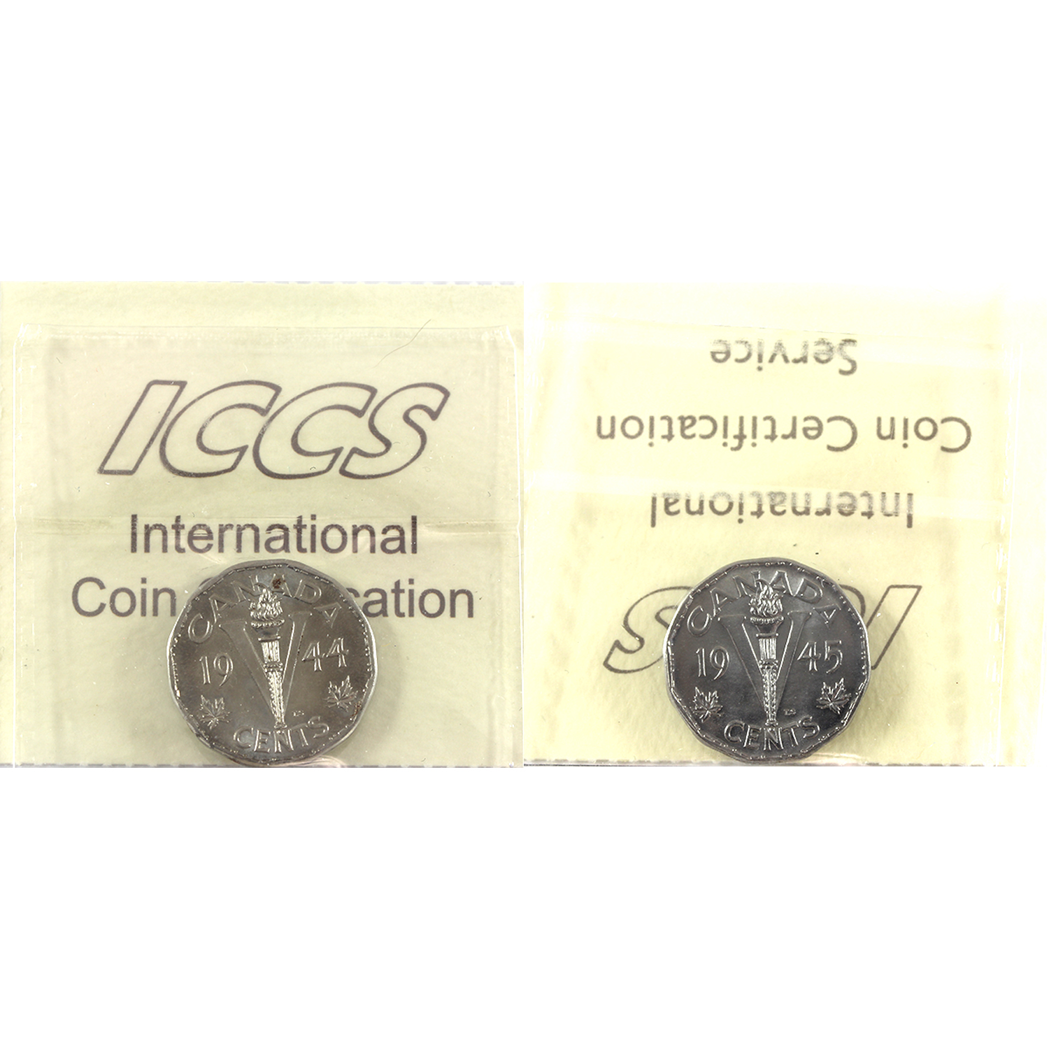 5-cent 1944 & 1945 ICCS MS65. 2pcs.