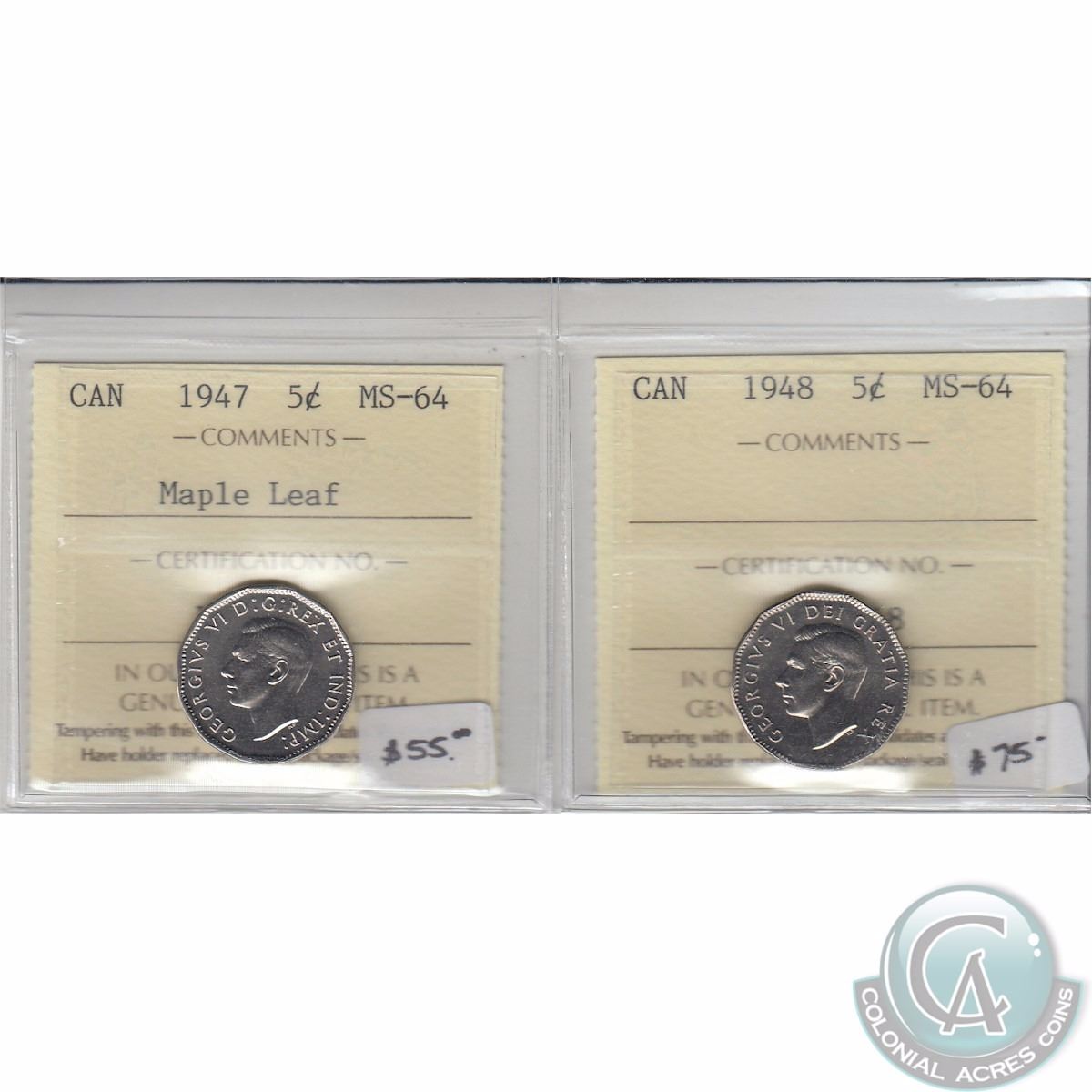 5-cent 1947 Maple Leaf & 1948 both ICCS Certified MS-64. (2pcs)