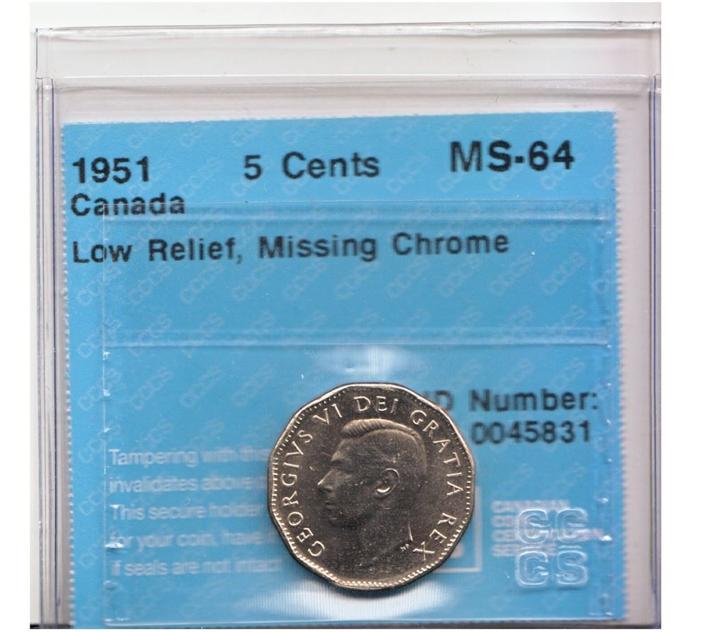5-cent 1951 CCCS MS-64, Low Relief, Missing Chrome