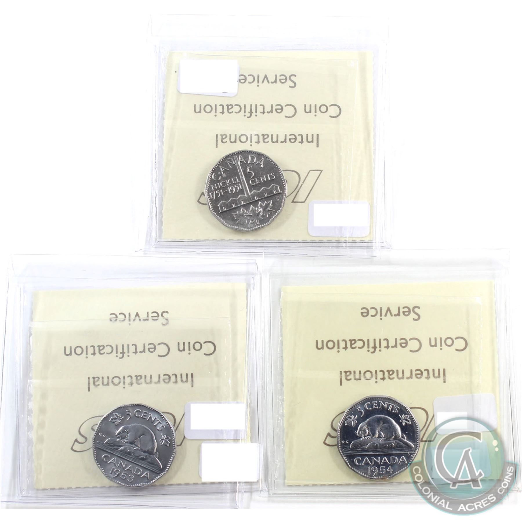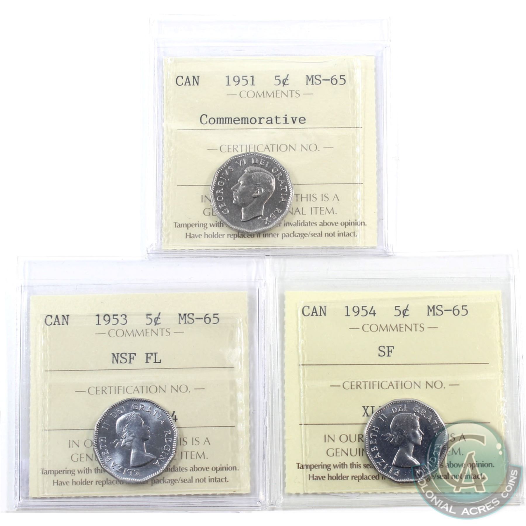 5-cent 1951 Commemorative, 1953 NSF FL & 1954 SF ICCS Certified MS-65. 3pcs