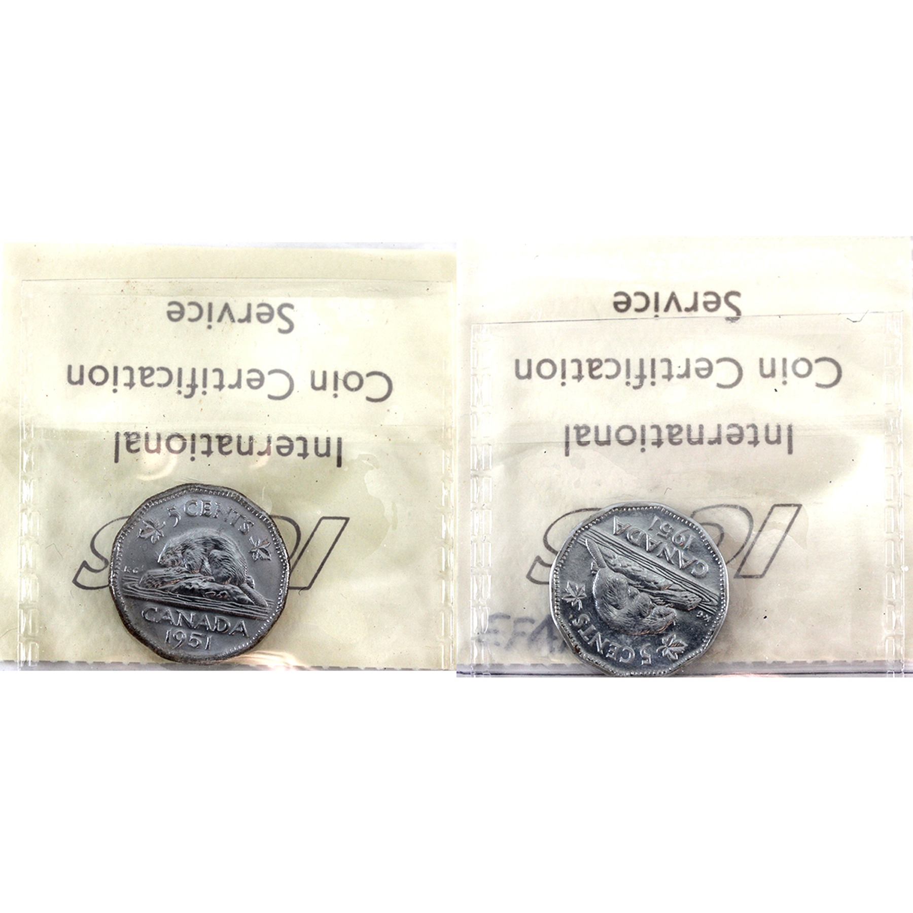 5-cent 1951 High Relief EF40 (Rust) & Low Relief MS63 (Rust) both ICCS. 2pcs